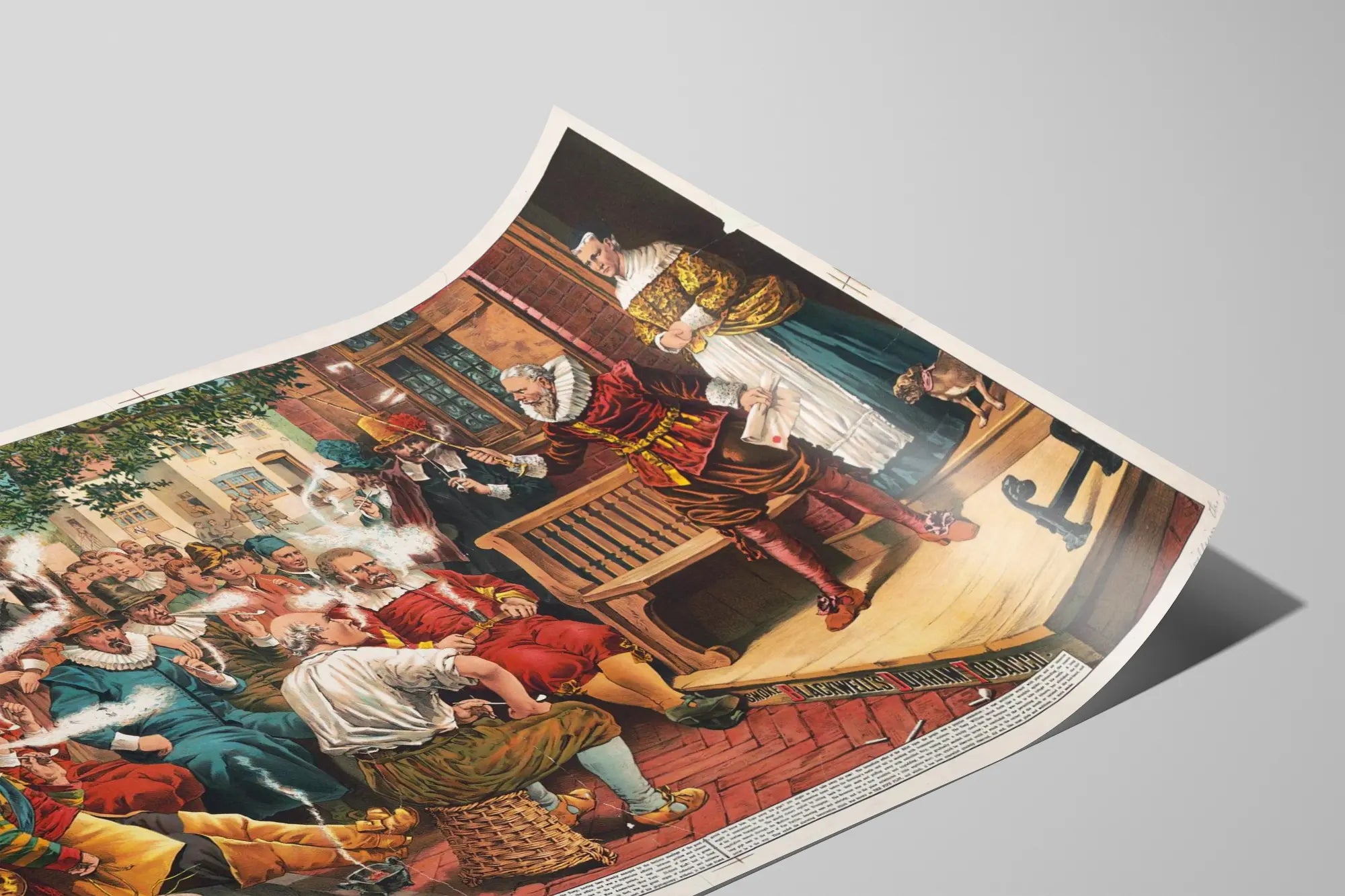 Cette affiche vintage intitulée "Smoke Blackwell's Durham" illustre un incident notable dans l'histoire de New Amsterdam, l'ancien New York. Parfaite pour une décoration murale unique, cette représentation colorée capture une scène animée où plusieurs personnages du XVIIe siècle fument du tabac Blackwell's Durham. La composition met en avant un groupe d'hommes vêtus de costumes d'époque, certains assis, d'autres debout, tous produisant des volutes de fumée visibles, soulignant l'importance de cette marque de tabac à travers l'histoire. En arrière-plan, des badauds attentifs observent la scène, rehaussant l'authenticité historique de l'affiche. Le cadre architectural et le mobilier, comme le banc de bois, renforcent l'atmosphère d'antan, idéale pour un style décoratif rétro ou historique. Ce poster d'illustration ancienne conviendra parfaitement à un intérieur recherchant un style vintage et culturellement riche, qu'il s'agisse d'un salon, d'un bureau ou d'un espace de détente. Son style pictural précis et ses couleurs vibrantes apporteront une touche d'élégance et d'authenticité. L'affiche Smoke Blackwell's Durham est un choix remarquable pour les amateurs de décoration murale classique, les passionnés d'histoire américaine, ou toute personne souhaitant enrichir son intérieur avec une œuvre racontant une anecdote du passé. Intégrée dans un cadre approprié, cette œuvre décorative contribue à créer une ambiance chaleureuse et conviviale, en mêlant art et patrimoine. Ce poster peut aussi s'associer harmonieusement avec d'autres affiches ou tableaux historiques pour constituer une collection murale thématique.