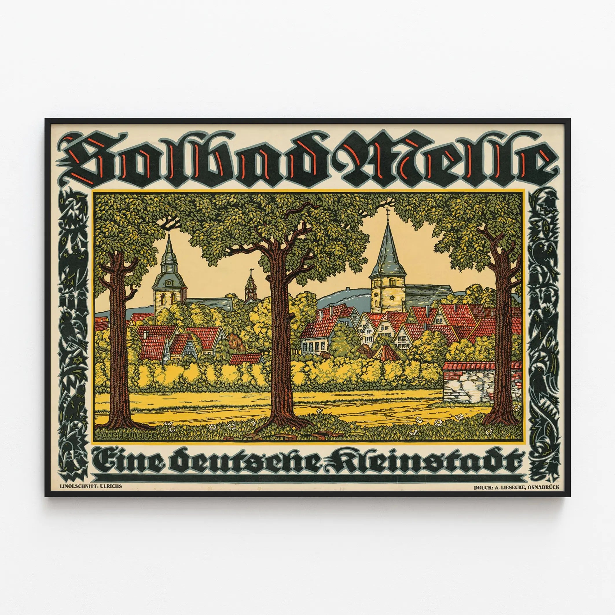 Cette affiche vintage Solbad Melle capture avec finesse l'atmosphère pittoresque d'une petite ville allemande typique. Représentant un paysage urbain bordé d'arbres imposants, l'œuvre met en lumière des maisons à toits rouges et des églises à flèches caractéristiques, nichées au cœur d'une végétation dense et verdoyante. Le style graphique, avec ses lignes précises et ses couleurs chaleureuses dominées par le vert, le jaune, le rouge et le gris, rappelle la technique du linogravure, offrant à cette décoration murale un charme rétro unique. Le cadre orné gravé avec des motifs d'oiseaux et de feuillages renforce le côté authentique et artisanal du poster. Cette illustration invite à la contemplation d'un cadre paisible et bucolique, parfait pour apporter une touche d'histoire et de tradition allemande à votre intérieur. Que ce soit pour un salon, un bureau ou une salle de lecture, cette affiche est un choix idéal pour les amateurs de décoration murale au style classique et régional. Facile à intégrer dans différents styles d'aménagement, ce poster est un véritable hommage à l'architecture et au paysage des petites cités allemandes, offrant une ambiance chaleureuse et accueillante. Rehaussée par des typographies gothiques qui soulignent le titre "Solbad Melle" et la description "eine deutsche Kleinstadt", cette œuvre iconique s'impose comme une pièce maîtresse dans la collection d'affiches rétro et authentiques. Découvrez un univers visuel riche en détails et en couleurs qui sublimera vos murs avec élégance et culture.
