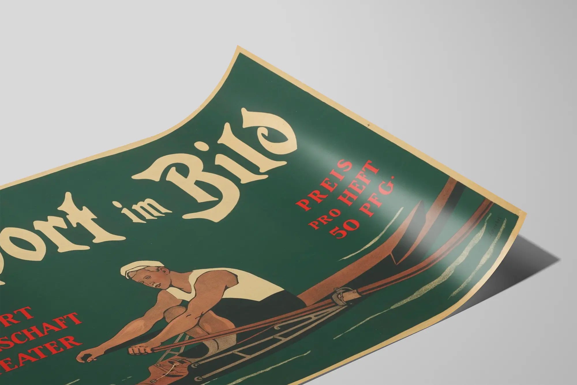 Cette affiche vintage intitulée "Sport im Bild" est une pièce de décoration murale unique mettant en scène un rameur en pleine action. Avec un fond vert foncé et des inscriptions en lettres anciennes blanches et rouges, cette affiche évoque un mélange subtil entre sport, société et théâtre. Le sujet central de cette décoration murale est un homme habillé en tenue d'aviron traditionnelle, illustré dans un style graphique rappelant les affiches des premières décennies du XXe siècle. Les couleurs sobres mais contrastées renforcent le côté rétro et élégant, ce qui en fait un poster parfait pour ceux qui souhaitent apporter une touche sportive et artistique à leur intérieur. Parfaite pour les passionnés de sport et de vintage, cette affiche s'intègre aussi bien dans une salle de sport que dans un salon ou un bureau. Sa typographie ancienne et ses motifs simples en font un objet d'art décoratif captivant et chargé d'histoire. Que ce soit pour une collection d'affiches sportives ou pour décorer un espace dédié au mouvement et à la performance, cette affiche vintage de rameur constitue un élément décoratif original et intemporel.