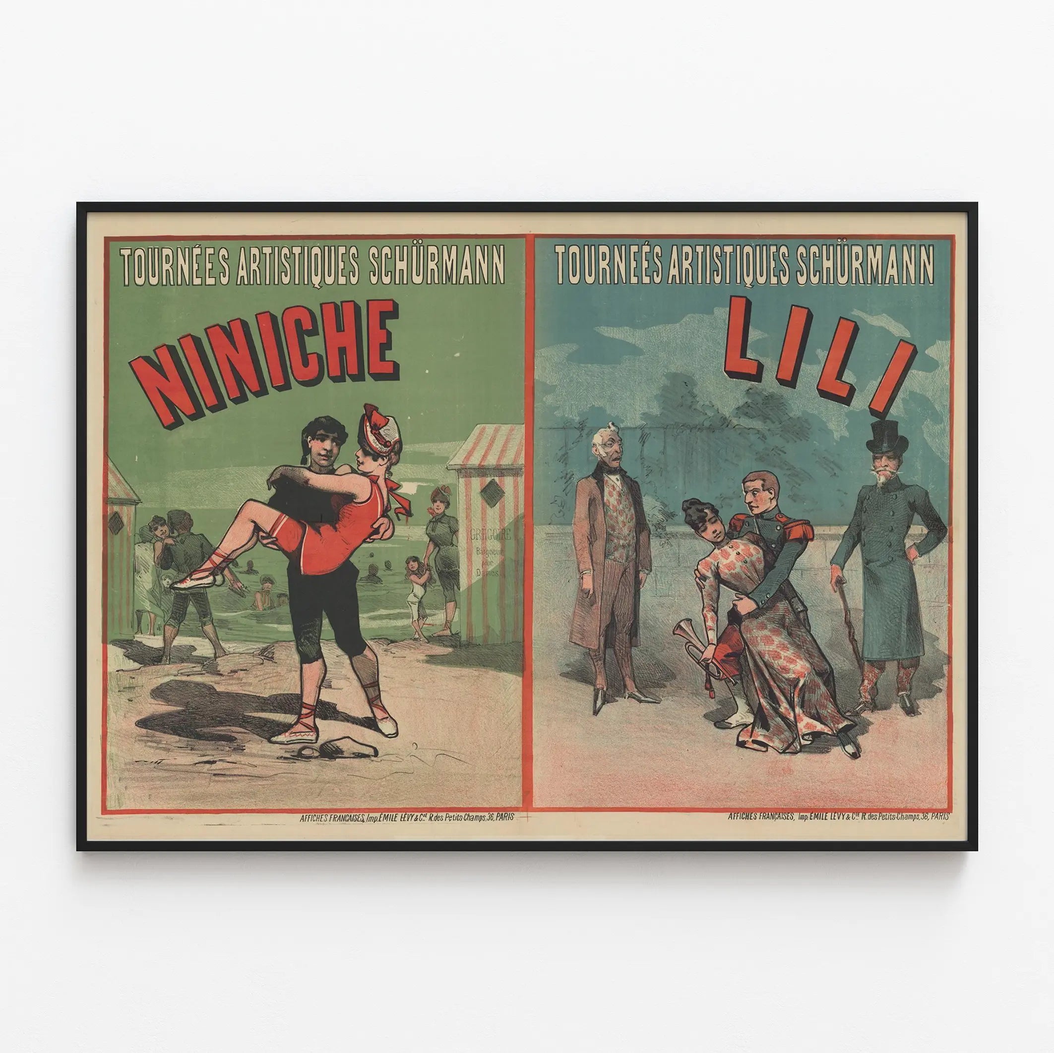 Découvrez cette affiche originale et vintage des Tournées Artistiques Schürmann, présentant les spectacles Niniche et Lili. Cette décoration murale se compose de deux illustrations distinctes juxtaposées, imprimées sur fond pastel aux teintes vert et bleu-gris, rehaussées d'un cadre rouge. Le poster met en scène des personnages dans des situations théâtrales ou de mise en scène artistique, avec un style graphique typique de l'affiche ancienne française. Sur la partie gauche, Niniche, en tenue rouge et sandales lacées, est portée dans les bras d'un jeune homme vêtu de noir, sur fond de plage avec des baigneurs et cabines rayées. À droite, Lili, élégante dans une robe à motifs floraux, est soutenue par un militaire en uniforme, entourés d'hommes au regard intrigué ou préoccupé, dans une ambiance de jardin ou de cour, amplifiée par des ciels nuageux. La typographie en haut de chaque partie souligne le titre "Tournées Artistiques Schürmann", conférant au poster un aspect promotionnel à l'ancienne. Ce tableau décoratif vintage est idéal pour une ambiance rétro, apportant une touche d'histoire du théâtre et du spectacle sur vos murs. Utilisé comme affiche murale, ce visuel est parfait pour les amateurs de décoration murale artistique et ancienne, recherchant un poster au charme authentique et narratif. Sa composition équilibrée et son jeu de couleurs subtiles s’adaptent aussi bien à un intérieur classique qu'à un style plus éclectique, soulignant l'élégance et la nostalgie des tournées artistiques du passé. Chaque affiche contribue à recréer un univers théâtral et festif, invitant à la découverte et à la contemplation. Ce poster original fait partie d'une série d’affiches françaises imprimées par Émile Lévy & Cie, située à Paris, renforçant son caractère historique et culturel. Complétez votre décoration murale avec cette œuvre vintage qui célèbre l'art et le spectacle à travers une représentation graphique riche et évocatrice.