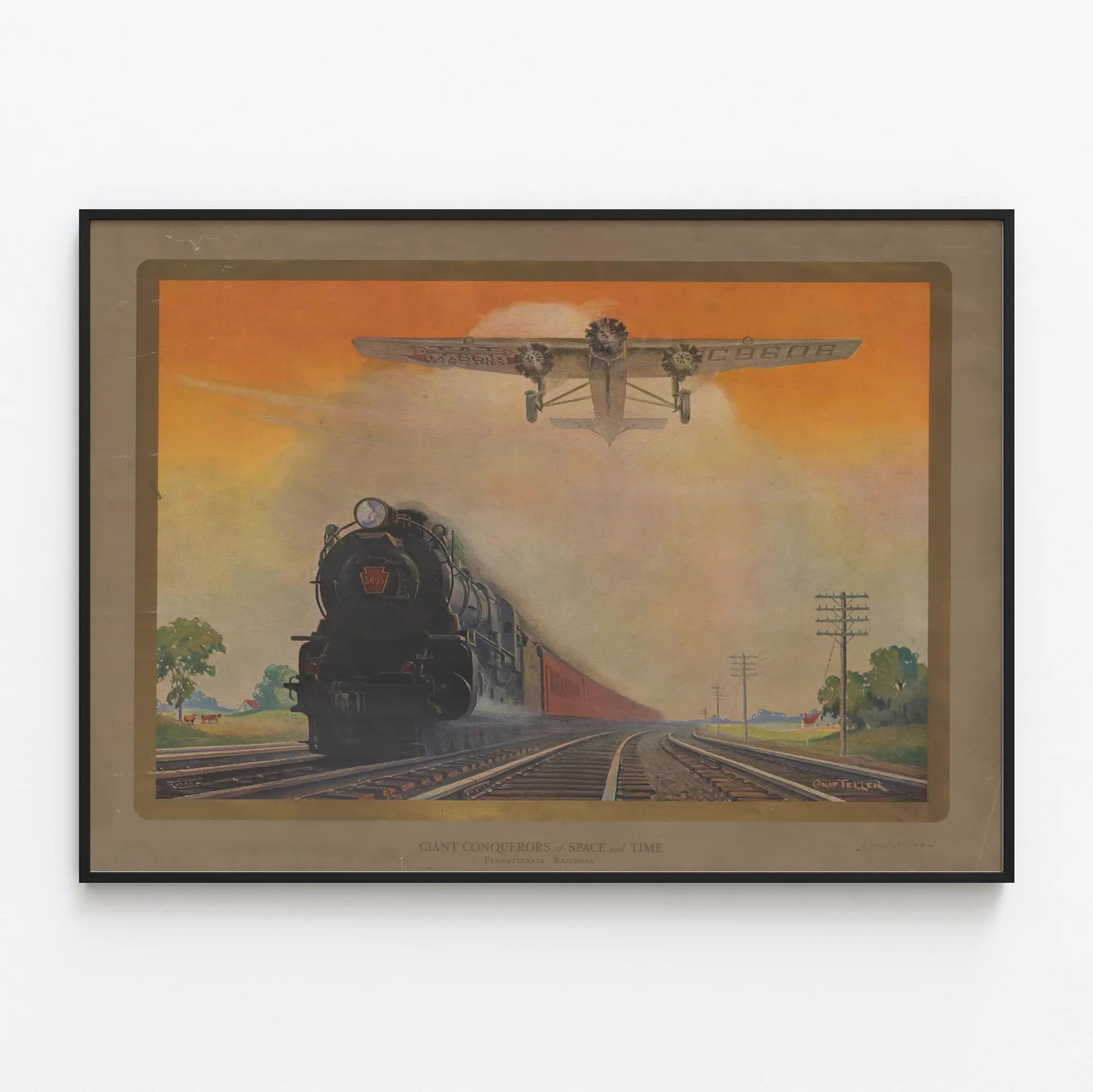 Cette affiche vintage intitulée « Giant Conquerors of Space and Time » met en scène une puissante locomotive à vapeur en premier plan, accompagnée d'un avion stylisé en arrière-plan. Représentant la Pennsylvania Railroad, ce poster évoque le thème de la conquête de l'espace et du temps à travers les moyens de transport emblématiques du début du 20ème siècle. La composition visuelle dynamique présente la locomotive noire qui s'élance sur les rails, avec un ciel aux teintes chaudes orangées formant un contraste marqué avec le paysage rural environnant. Ces éléments apportent une atmosphère nostalgique et industrielle à cette décoration murale. Ce tableau d'inspiration rétro est parfait pour les amateurs d'histoire des transports, de vintage et de design graphique d’époque. Il s'intégrera aisément dans un intérieur cherchant à accentuer une ambiance industrielle ou nostalgique, faisant de cette affiche un objet décoratif mural à la fois esthétique et chargé de sens. Idéal pour habiller un mur dans un bureau, un salon ou une pièce dédiée aux loisirs, ce poster vintage sur le thème ferroviaire et aéronautique est un choix incontournable pour recréer un univers où la technique rencontre l'aventure.