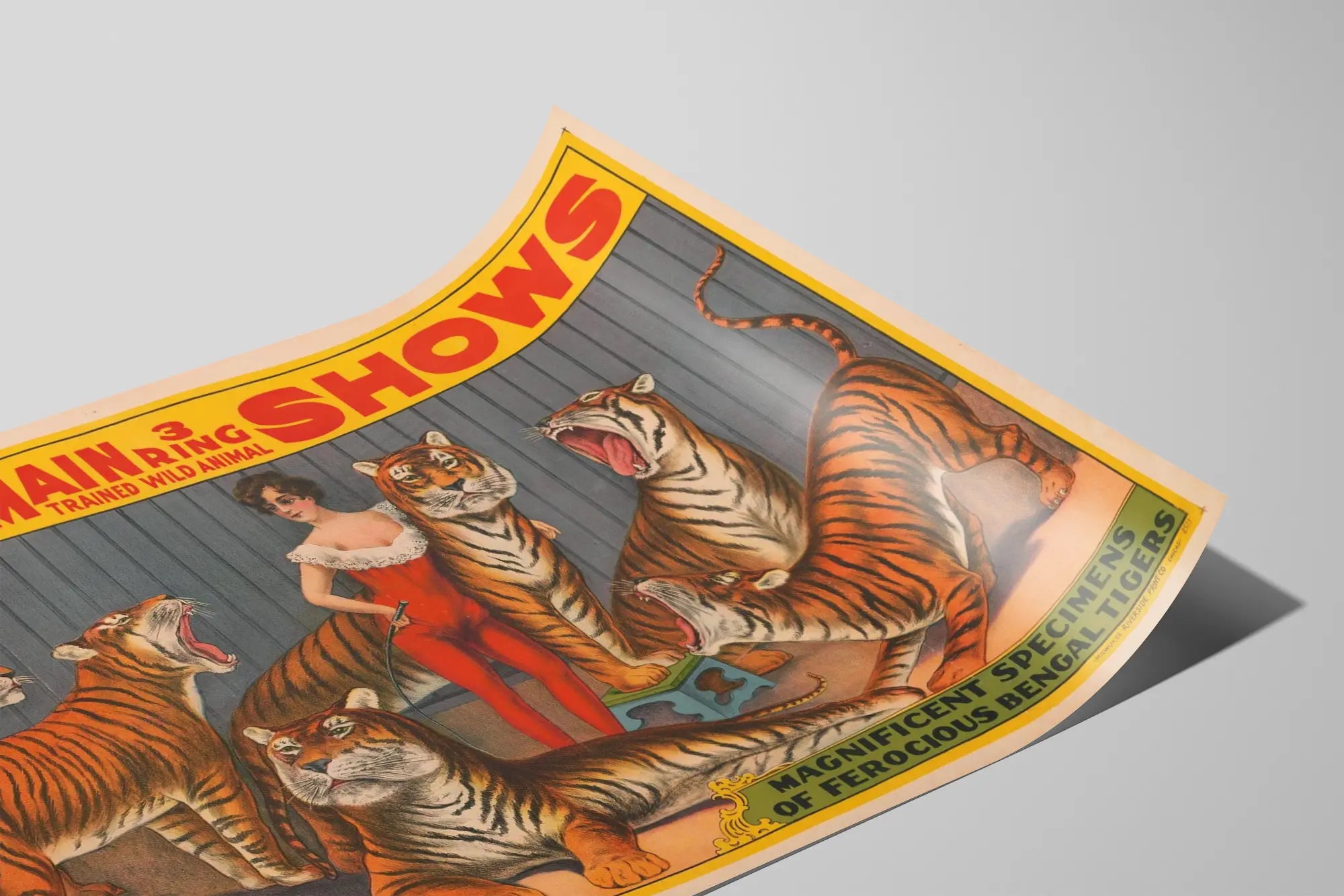 Apportez une touche rétro et sauvage à votre décoration murale avec cette affiche vintage "Walter L. Main 3 Ring Trained Wild Animal Shows". Cette magnifique illustration met en scène une dresseuse de tigres vêtue d'un justaucorps rouge, entourée de six tigres du Bengale aux expressions variées, allant du calme au rugissement impressionnant. Le fond de l'affiche, aux teintes neutres, fait ressortir les couleurs chaudes et vibrantes des tigres et du costume de la dresseuse, créant un contraste saisissant qui capte immédiatement l'attention.