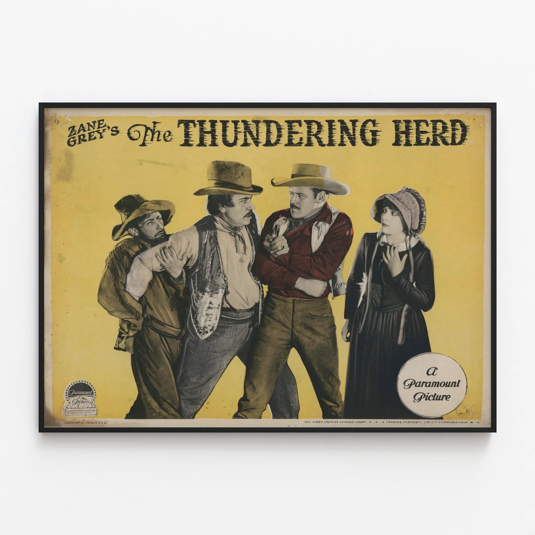 Découvrez cette affiche vintage du film western "The Thundering Herd", une pièce emblématique pour toute décoration murale d'inspiration Far West. Sur un fond jaune éclatant, cette affiche met en scène quatre personnages en costume d'époque, arborant chapeaux de cow-boy, vêtement traditionnels et expressions intenses, typiques du genre western. Ce poster est idéal pour apporter une touche rétro et authentique à un intérieur, grâce à son style graphique unique et ses couleurs contrastées qui captivent l'œil. Parfait pour les amateurs de films classiques ou de décorations murales thématiques, ce tableau apporte une ambiance historique et dramatique à votre pièce. Les détails des costumes et l'atmosphère de confrontation sont mis en valeur par un travail visuel soigné, faisant de ce poster une décoration murale à la fois artistique et évocatrice. Que ce soit dans un salon, une salle de cinéma privée ou un bureau, cette affiche vintage affirme un style déco audacieux et plein de caractère. Offrez à vos murs un voyage dans le temps avec ce poster inspiré par l'univers du western, un incontournable pour tous les passionnés de cinéma classique et d'objets décoratifs originaux.