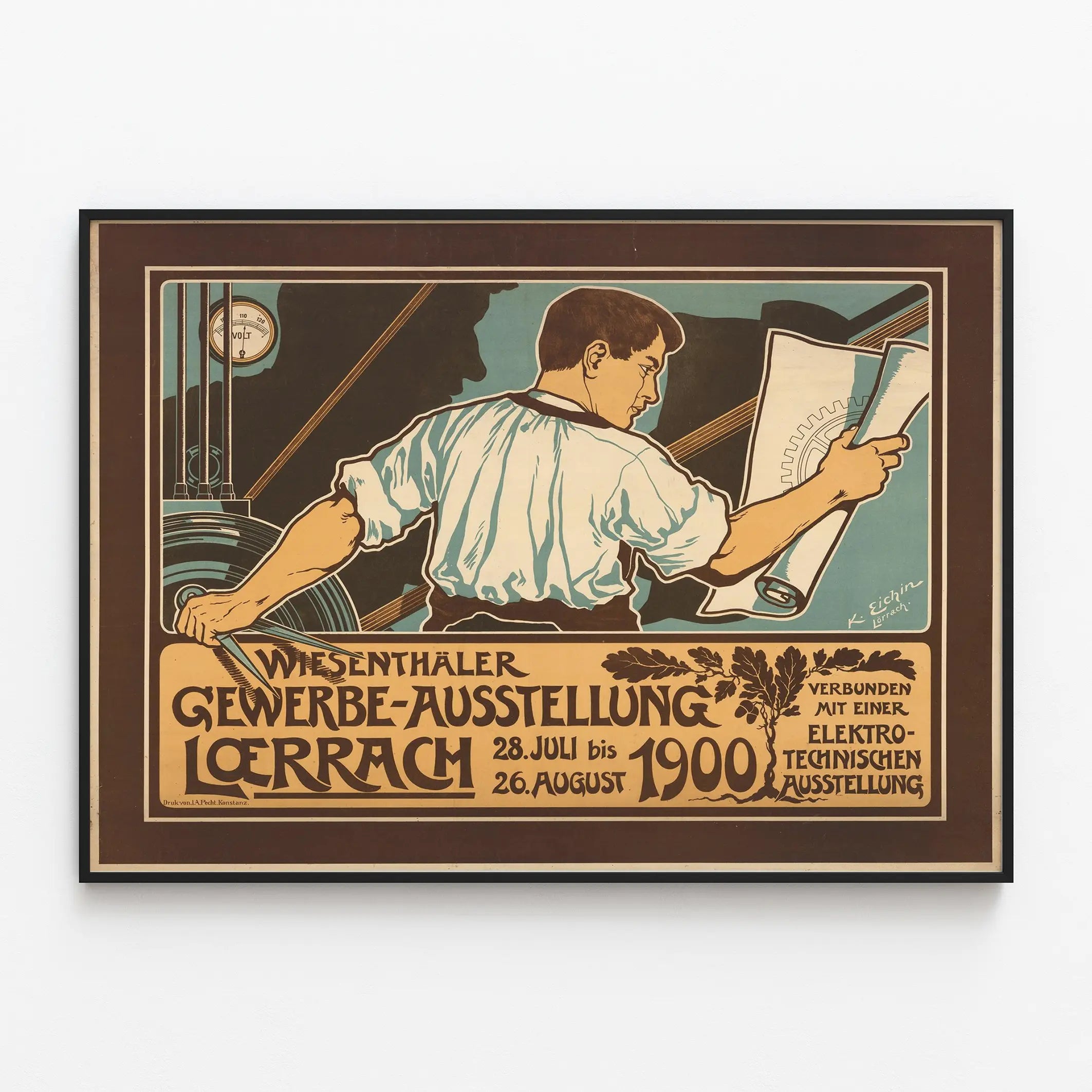 Cette affiche vintage publicitaire d'époque 1900 met en avant la "Wiesenthäler Gewerbe-Ausstellung" à Loerrach, un événement industriel et artisanal majeur qui s'est tenu du 28 juillet au 26 août. La scène centrale représente un ouvrier ou ingénieur vêtu d'une chemise claire, concentré sur un plan technique détaillé illustrant un engrenage, symbole des progrès industriels et mécaniques de la fin du XIXe siècle. Sur le côté, on aperçoit un voltmètre marqué "Volt" témoignant de la dimension électrique associée à cette exposition, intégrée à une section spécifique dédiée à la technologie électrique (Elektrotechnischen Ausstellung). L'ensemble de l'image est encadré d'une manière graphique caractéristique du style Art Nouveau, avec une palette de couleurs sobres dominée par des tons bruns, bleus et beige. Ce poster est un exemple remarquable de décoration murale vintage pour les amateurs d'histoire industrielle, de design rétro et d'affiches anciennes. Il s'adapte parfaitement à une décoration murale thématique dans un bureau, un atelier ou un salon, apportant une touche authentique et graphique. Ce tableau mural illustre aussi l'importance des expositions commerciales dans la promotion des innovations techniques à la veille du XXe siècle. Son esthétique rétro et son message historique en font un incontournable du poster d'époque pour les passionnés de décoration murale historique et industrielle.
