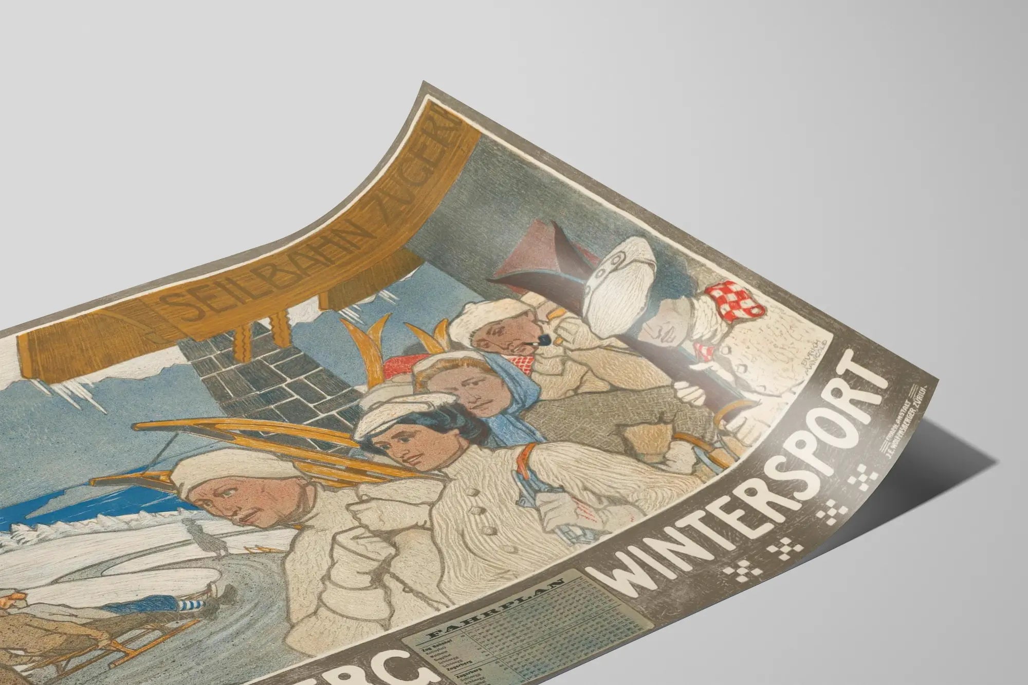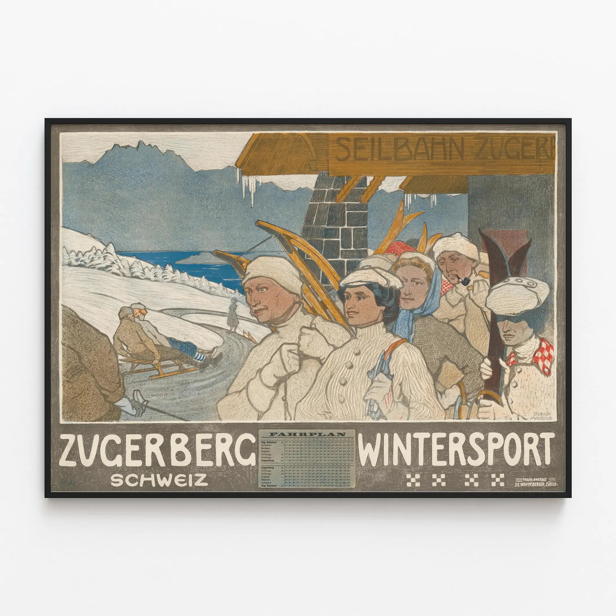 Découvrez cette affiche vintage exceptionnelle dédiée au Zugerberg, une destination emblématique du sport d'hiver en Suisse. Ce poster représente un groupe de skieurs et amateurs de sports d'hiver vêtus d'habits traditionnels, prêts à profiter des pistes enneigées sous un ciel clair. On y voit également une luge sur un chemin sinueux qui descend entre les sapins couverts de neige, avec en arrière-plan une étendue d'eau et une chaîne de montagnes imposante, offrant un paysage typique des Alpes suisses.