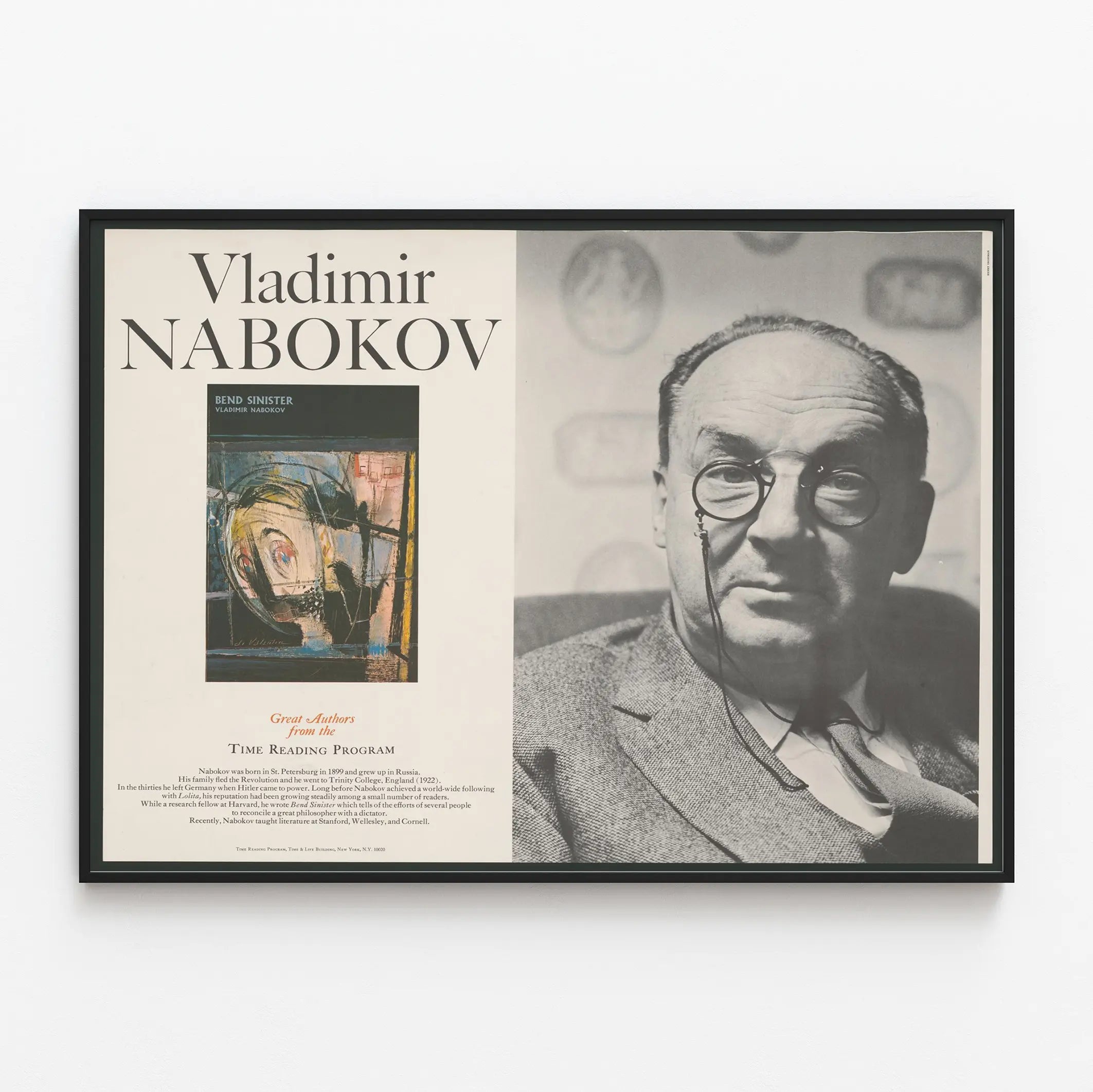 Apportez une touche d'élégance et de culture à votre décoration murale avec cette affiche dédiée à Vladimir Nabokov, figure emblématique de la littérature du XXe siècle. Ce poster combine une photo en noir et blanc du célèbre écrivain, reconnue pour son look caractéristique avec un monocle, et une synthèse biographique de sa vie et de son œuvre, offrant une pièce décorative à la fois informative et esthétique. Cette affiche met en avant l'image sérieuse et intellectuelle de Nabokov, parfait pour les amateurs de littérature et les passionnés de décoration murale contemporaine et raffinée. Le texte présente son parcours, de ses origines à Saint-Pétersbourg, à son exil et ses activités universitaires, en passant par son travail littéraire notable tel que « Bend Sinister ». Ce tableau mural est idéal pour les bibliothèques, les salles d’études ou les espaces de vie où l’on souhaite créer une ambiance inspirante autour des grands auteurs. Son design vertical avec une mise en page claire et équilibrée facilite son intégration dans diverses ambiances décoratives, du classique au moderne. Offrez-vous une affiche littéraire qui célèbre la grandeur des auteurs et enrichissez votre intérieur d’une décoration murale authentique et prestigieuse.