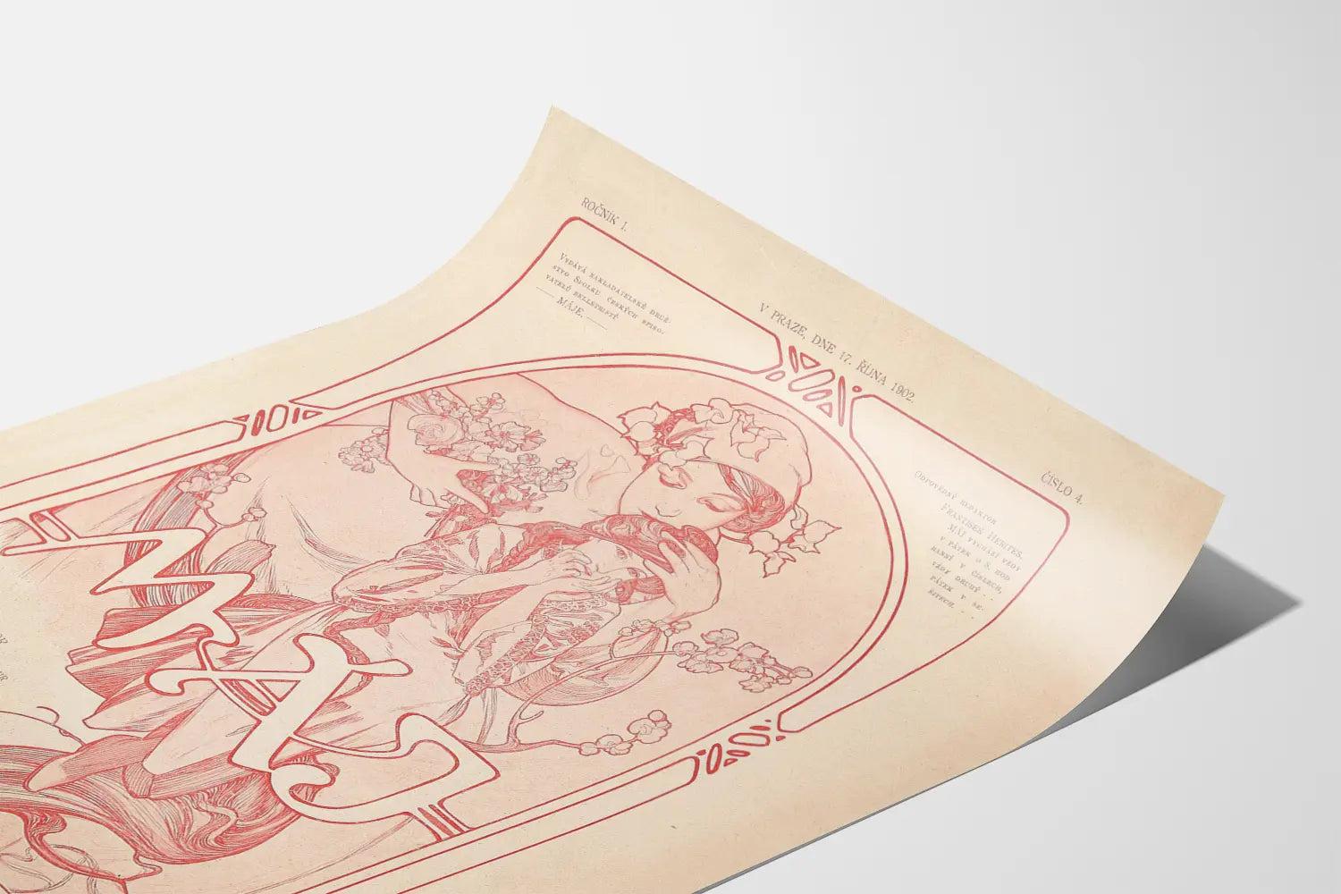 Denne vintageplakat MÁJ 1902 tilføjer et elegant og historisk præg til enhver vægdekoration. Dateret til 1902 illustrerer den en typisk art nouveau-stil med sine bølgende linjer og fine blomstermotiver. Tegningen, udført i røde nuancer på en beige baggrund, viser to kvindefigurer omgivet af blomster, hvilket indkapsler en blid og poetisk stemning. Kunstværket fremkalder en følelse af ømhed og ro, perfekt til et interiør, der ønsker at forene ægthed og raffinement i sin indretning. Som vægplakat er denne plakat ideel til at dekorere en stue, et kontor eller et bibliotek, og bringer en tidsløs atmosfære, der minder om begyndelsen af det 20. århundrede. Det udsmykkede rammeværk og den gamle typografi gør dette stykke til en unik vægdekoration, både kunstnerisk og kulturelt. Dette papirbillede kan harmonisk integreres i en retro- eller vintageindretning, hvor de grafiske detaljer og den klassiske æstetik fremhæves. Uanset om det er til en kunstsamler eller en interiordesign-entusiast, der søger en original plakat, er denne udgave af MÁJ fra 1902 en smuk illustration af art nouveau i vægdekoration. Dets tidløse udseende inviterer til ro og eftertanke, hvilket gør denne plakat til et fuldgyldigt vægdekorationselement. Vælg dette stykke for at berige dit rum med et kunstnerisk og historisk præg, symbol på en tryk- og illustratørkunst fra en svunden tid, men stadig højt værdsat i dekorationsverdenen. Et perfekt valg for at tilføje karakter og dybde til dine vægge med en plakat, der har uomtvisteligt charme.