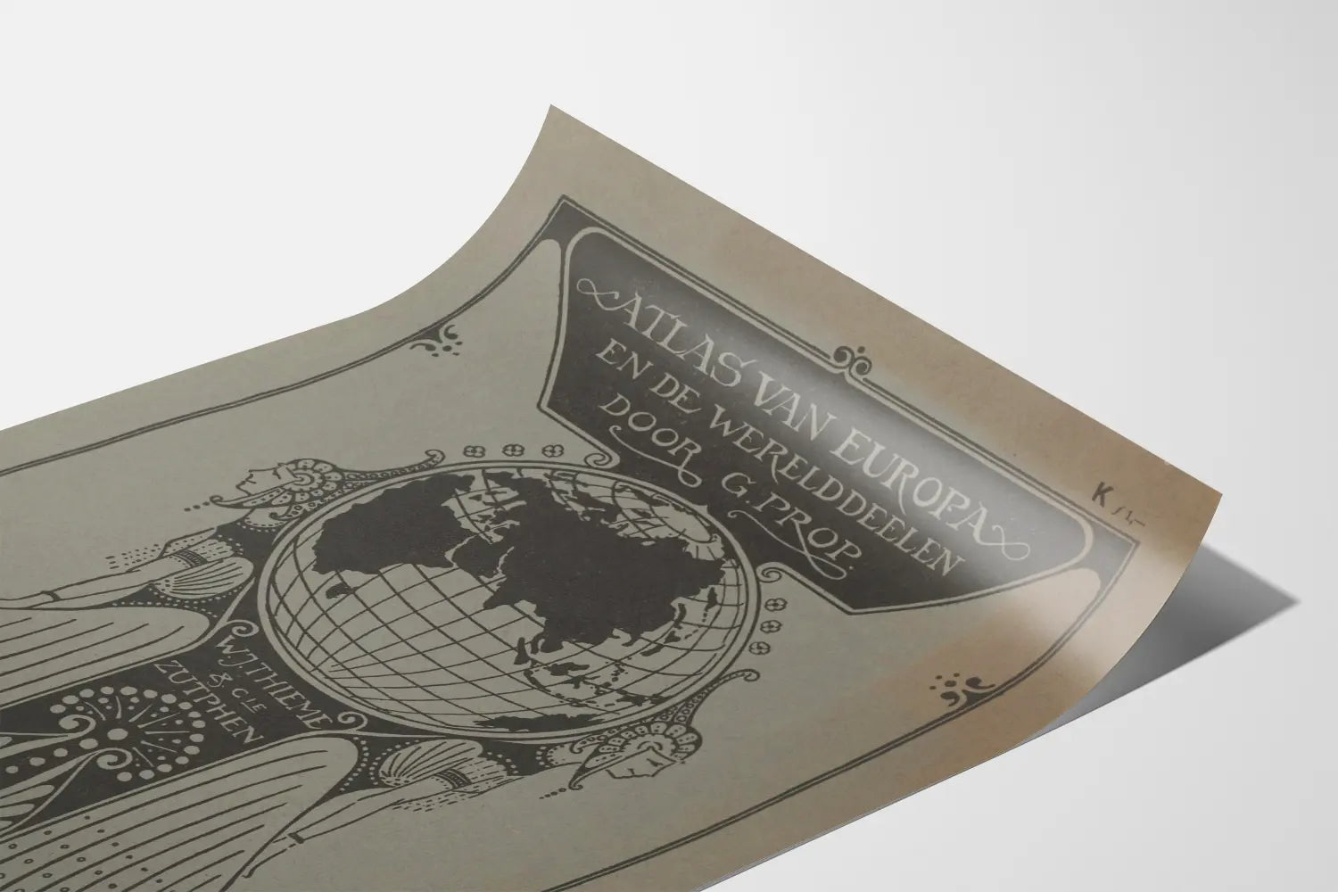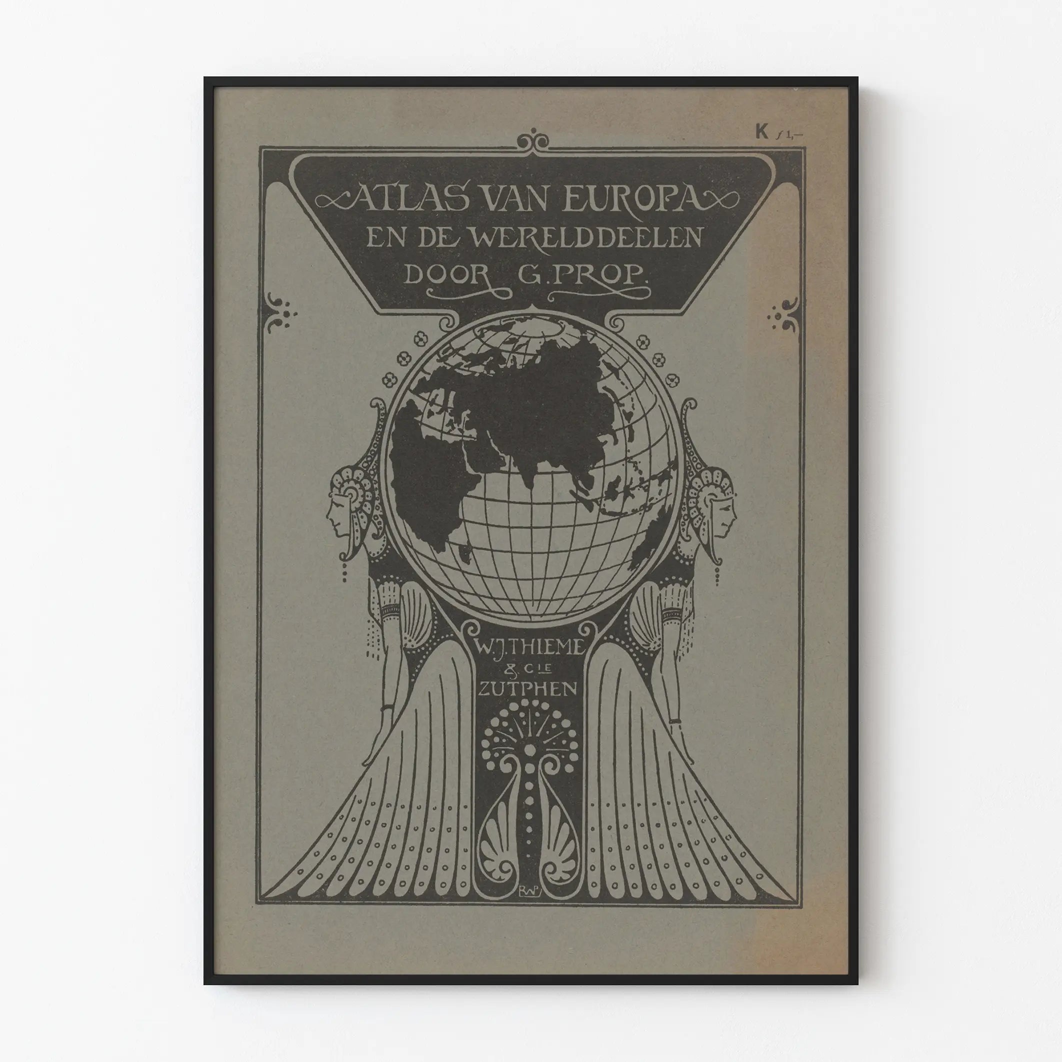 Denne vintageplakat viser forsiden af Europa- og Kontinentatlaset, værk af G. Prop udgivet af W.J. Thieme & Cie i Zutphen. Den udgør et unikt vægdekorationselement, ideelt for entusiaster af kortlægning og historie. Designet fremhæver et stiliseret verdenskort i sort på en grå baggrund, indrammet af to kvindefigurer i art déco-stil, sandsynligvis symboliserende stabilitet og visdom, hvilket tilføjer et kunstnerisk og elegant præg til plakaten. Den hollandske tekst tydeligt angiver titlen på atlaset, hvilket understreger dets autentiske og gamle karakter. Denne vintageplakat kan bruges som dekorativ plakat i et kontor, en stue eller et bibliotek, og bringer en kultur- og raffineret atmosfære. Dets typografi og grafiske ornamenter understreger dets kunstneriske og gamle karakter, hvilket gør den til en perfekt tilføjelse til et klassisk eller retro dekorativt univers. Gennem sin geografiske fremstilling vækker den også nysgerrighed og beundring for verden gennem en historisk linse. Uanset om du søger en vægdekoration til et europæisk rum eller til en tematiseret indretning om geografi og rejser, er denne G. Prop atlasplakat et markant valg. Den henvender sig til kunstentusiaster og samlere af ældre kortobjekter. Kvaliteten af grafikken og den visuelle sammensætning gør dette plakatsæt til et tilgængeligt og unikt vægdekorationselement, der kan fremhæve enhver væg med en kulturel og æstetisk note. Kort sagt repræsenterer denne plakat af Europa- og Kontinentatlaset en perfekt kombination af grafisk kunst, kortlægning og vægdekoration. Den forener elegance, historie og modernitet i en enkel og tidløs stil.