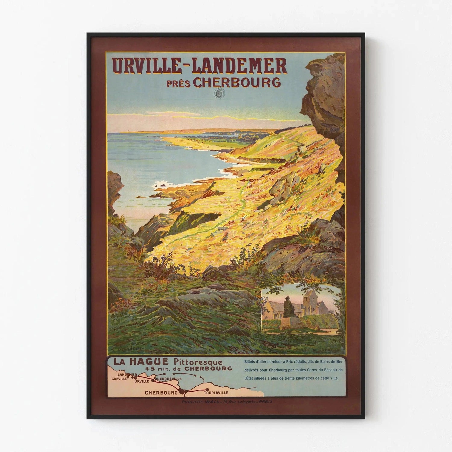 Designet i 1910'erne–1930'erne fremhæver denne illustration et lyst og stejlt panorama. De gyldne klipper, blomstrende heder og det glitrende hav byder på en kraftfuld og bevaret naturscene. Nederst på plakaten er et kort, der viser Urville-Landemer, et lille paradis gemt 45 minutter fra Cherbourg, i et af Normandiets mest vilde landskaber.