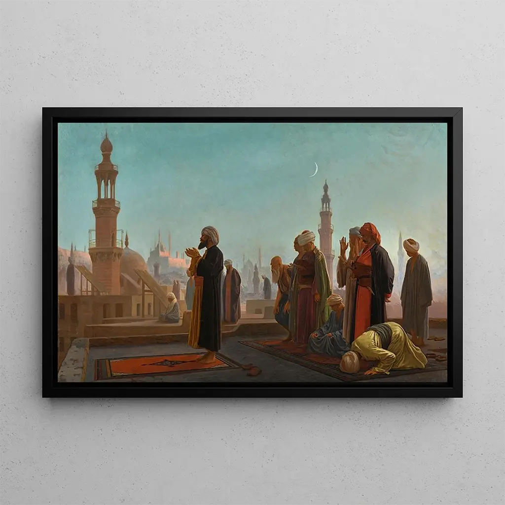 Jean-Léon Gérôme, født i 1824, er en af de mest ikoniske kunstnere inden for den orientalistische bevægelse. Hans karriere, præget af rejser i Orienten, har givet ham mulighed for at udforske eksotiske temaer og scener fra dagligdagen i lande som Egypten og Tyrkiet. Influenceret af neoklassicisme og romantik, formåede Gérôme at kombinere teknisk præcision med kunstnerisk følsomhed. Hans kunstværker, ofte fyldt med symbolik, vidner om en dyb respekt for de kulturer, han skildrer. "Aftensbøn i Kairo" er et perfekt eksempel på hans talent, der kombinerer en trofast gengivelse med en åndelig og kontemplativ atmosfære.