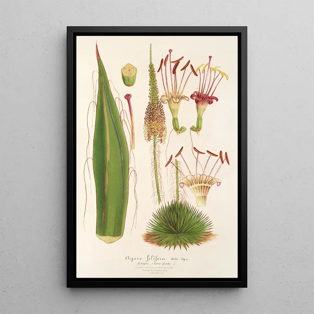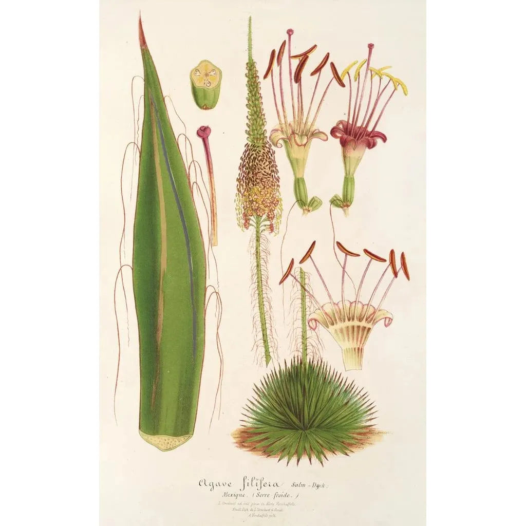 L'œuvre "Agave filifera" af Charles Antoine Lemaire er en fejring af naturen, hvor de delikate linjer i bladene blander sig med nuancer af strålende grøn. Kompositionen fremkalder en subtil harmoni mellem den geometriske præcision af planten og den flydende lys, der leger over dens konturer. Lemaire, som en mester botaniker, bruger graveringsteknikker, der ikke kun afslører den æstetiske skønhed af agaveen, men også dens komplekse struktur. Atmosfæren, der udspringer af dette kunsttryk, er både rolig og fængslende, og inviterer betragteren til at dykke ned i den fascinerende verden af sukkulentplanter.