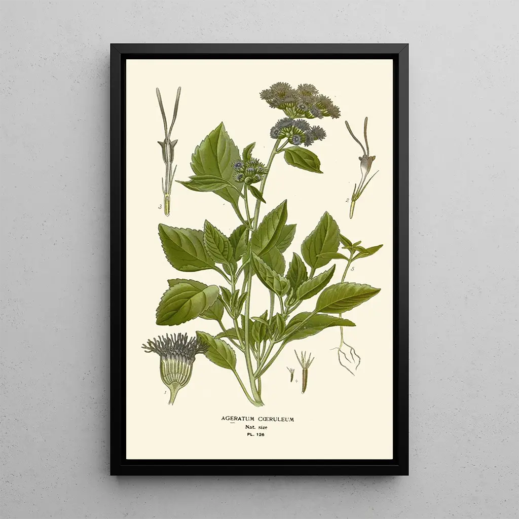 Kunsttrykket "Ageratum coeruleum" er et perfekt dekorativt valg til at berige dit opholdsrum. Uanset om det er i stuen, soveværelset eller på kontoret, tilføjer dette lærred et strejf af friskhed og ro. Dets kvalitet som kunsttryk sikrer en høj troværdighed af detaljerne i det originale værk, samtidig med at det giver en raffineret æstetik. Ved at integrere dette kunsttryk i din indretning skaber du en beroligende og elegant atmosfære, samtidig med at du fejrer blomsterens skønhed og naturens rigdom.