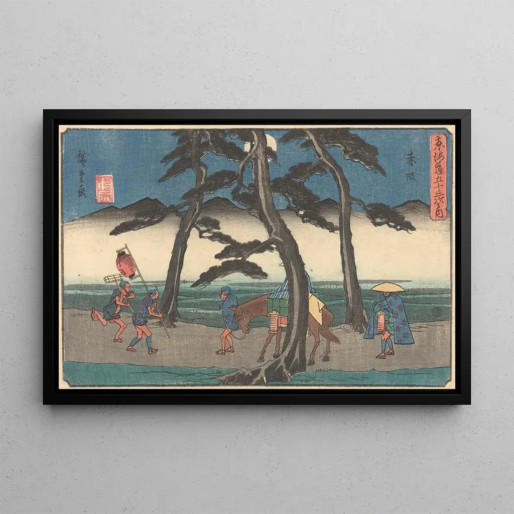 I kunsttrykket Akasaka fanger Andō Hiroshige essensen af et flygtigt øjeblik, hvor naturen og bylivet mødes. De levende farver, fra frodige grønne nuancer til dybe røde, skaber en livlig og dynamisk atmosfære. Træsnitsteknikken, typisk for ukiyo-e, giver Hiroshige mulighed for at lege med teksturer og nuancer, hvilket bringer hver detalje til live. Personerne, i bevægelse, synes næsten at træde ud af lærredet og inviterer betragteren til at dykke ned i denne livlige scene, hvor hverdagen smelter sammen med den naturlige skønhed.