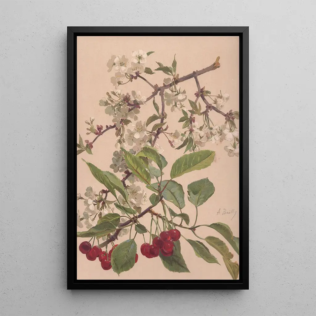 Alice Baillys akvarel af en kirsebærgren fremkalder en forårsmildhed, hvor de lyserøde blomsterblade danser let i vinden. Pastelfarverne blander sig harmonisk, hvilket skaber en rolig og beroligende atmosfære. Akvarellens teknik, med sine gennemsigtigheder og subtile overgange, fanger den flygtige skønhed af disse midlertidige blomster. Hvert penselstrøg synes at ånde liv, og inviterer betragteren til at dykke ned i en verden, hvor naturen blomstrer yndefuldt. Dette værk er en ægte fejring af den flygtige skønhed, et øjeblik fanget i tiden.
