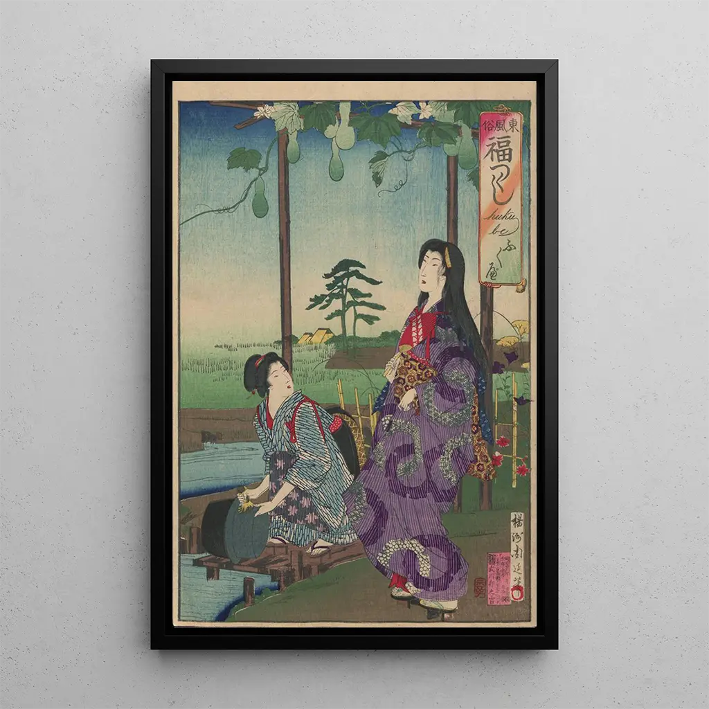 "L'Album de Nishikie Pl19" af Toyohara Chikanobu er et værk, der fremhæver den flygtige skønhed i traditionel japansk livsstil. Dette kunsttryk er kendetegnet ved livlige farver og fine mønstre, typiske for ukiyo-e-tryk. Chikanobu excellerer i at fange scener fra dagligdagen, hvor karaktererne, ofte omgivet af fortryllende landskaber, synes at blomstre i en atmosfære af ro. Hvert detalje, fra de udsmykkede tøj til de blomstrende baggrunde, bidrager til at skabe en poetisk og nostalgisk stemning, der inviterer betragteren til at dykke ned i en verden af flygtig skønhed.