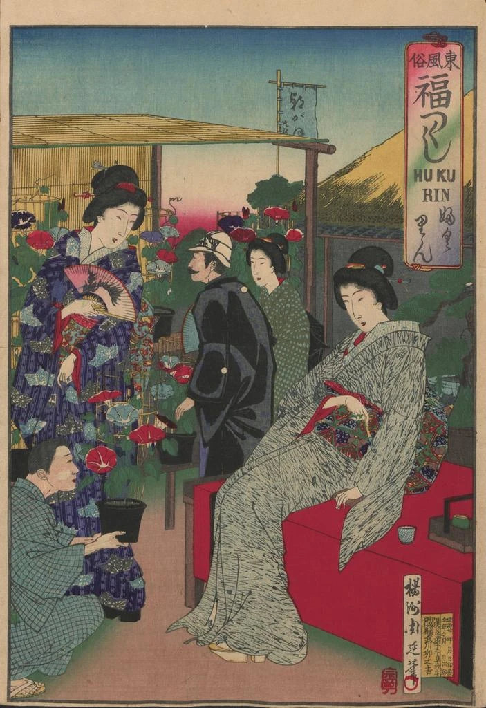I denne kunsttryk af L'Album de Nishikie Pl22 tager Toyohara Chikanobu os med ind i en rig verden fyldt med farver og detaljer. Kompositionen fremhæver elegant klædte personer, der bevæger sig i en delikat naturlig ramme. De skiftende nuancer, fra dybe røde til beroligende grønne, skaber en atmosfære, der er både dynamisk og fredelig. Ukiyo-e-teknikken, med sine flydende linjer og raffinerede mønstre, bringer denne scene til live og inviterer seeren til at fordybe sig i den flygtige skønhed i det daglige liv i Japan.