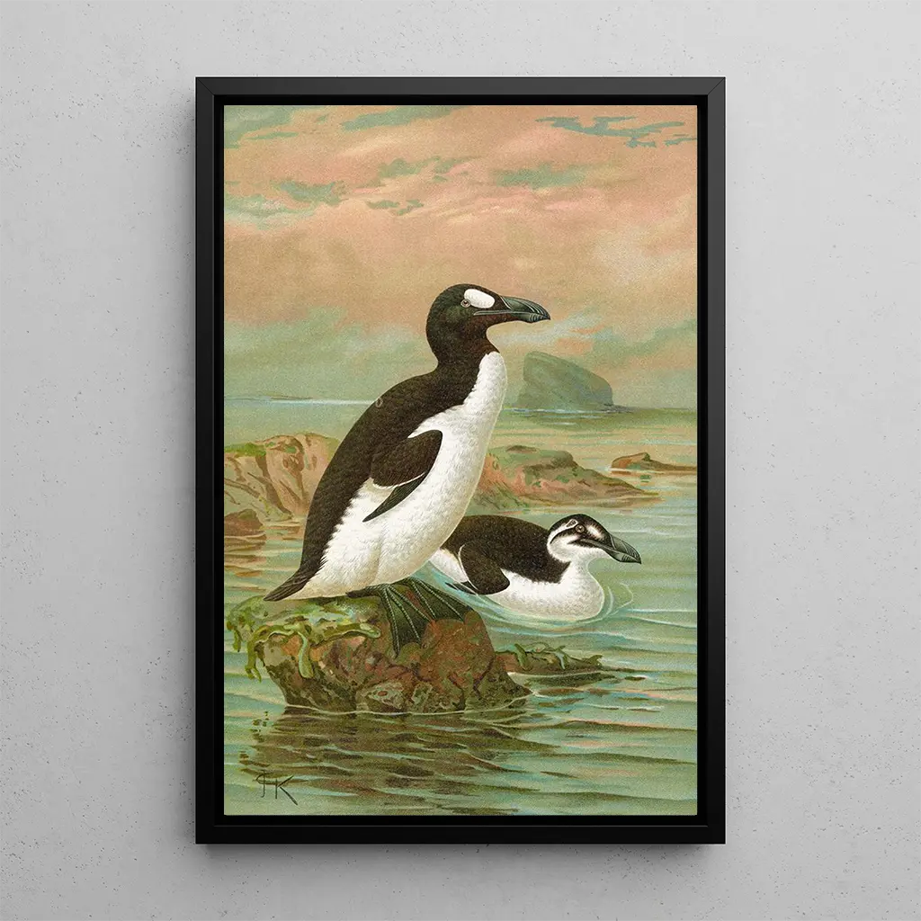 Kunsttrykket Alca impennis L Riesenalk, vær af Johann Friedrich Naumann, fremkalder majestæten af en nu forsvundet fugl. Med delikate farver, der spænder fra dyb sort til strålende hvid, fanger dette lærred essensen af naturen. Akvarelteknikken, anvendt med bemærkelsesværdig præcision, giver liv til denne havfugl, hvis blik synes at gennembore betragteren. Atmosfæren i værket er præget af melankoli, hvilket minder om biodiversitetens skrøbelighed og vigtigheden af artsbevarelse.