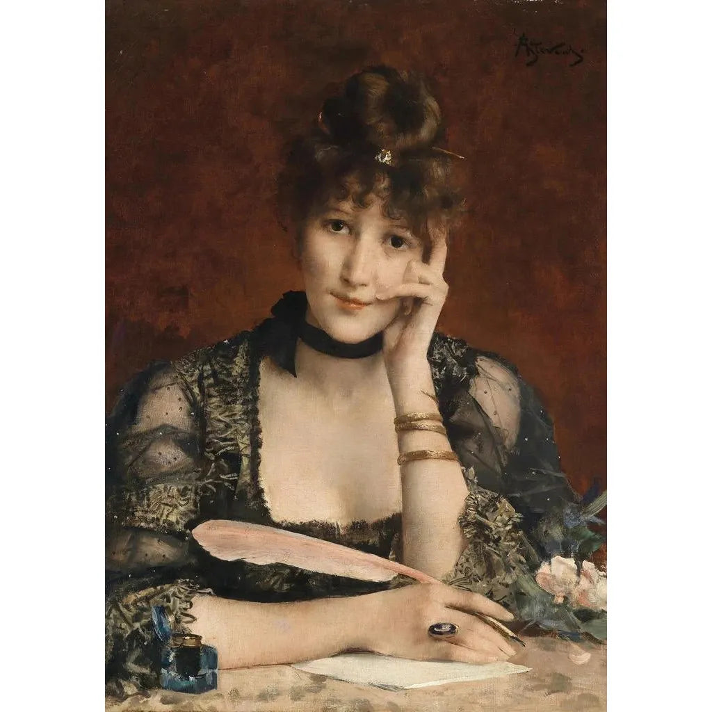 Alfred Stevens, belgisk kunstner fra det XIX. århundrede, er anerkendt for sin evne til at fortælle historier gennem sine kunsttryk. Påvirket af realisme og impressionisme, har han formået at skabe værker, der kombinerer skønhed og følelser. Hans motiver, ofte kvinder i intime situationer, afslører en unik følsomhed og særlig opmærksomhed på detaljer. "La lettre" er en del af denne tradition, der illustrerer ikke kun Stevens' tekniske kunnen, men også hans interesse for menneskelige relationer og livets øjeblikke. Hans arbejde fortsætter med at inspirere og fascinere, hvilket vidner om kunstens vigtighed i forståelsen af menneskelige følelser.