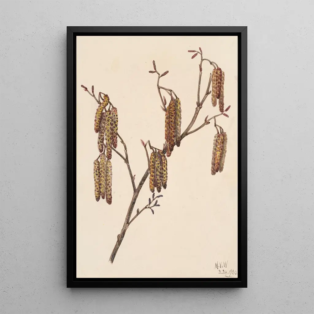 kunsttryk "Aulne coudrier Alnus regosa" af Mary Vaux Walcott tager os med ind i en naturlig verden, hvor finesse i træk og rigdom af farver væves sammen for at fange skønheden af et majestætisk træ. Kompositionen fremhæver de minutøse detaljer af blade og grene, hvilket afslører en palet af levende grønne nuancer og jordnære brune toner. Akvarelteknikken, anvendt med finesse, giver dette lærred en atmosfære, der både er rolig og livlig, og inviterer betragteren til en omhyggelig betragning af floraen. Hvert penselstrøg synes at ånde liv, og hylder naturens majestæt.