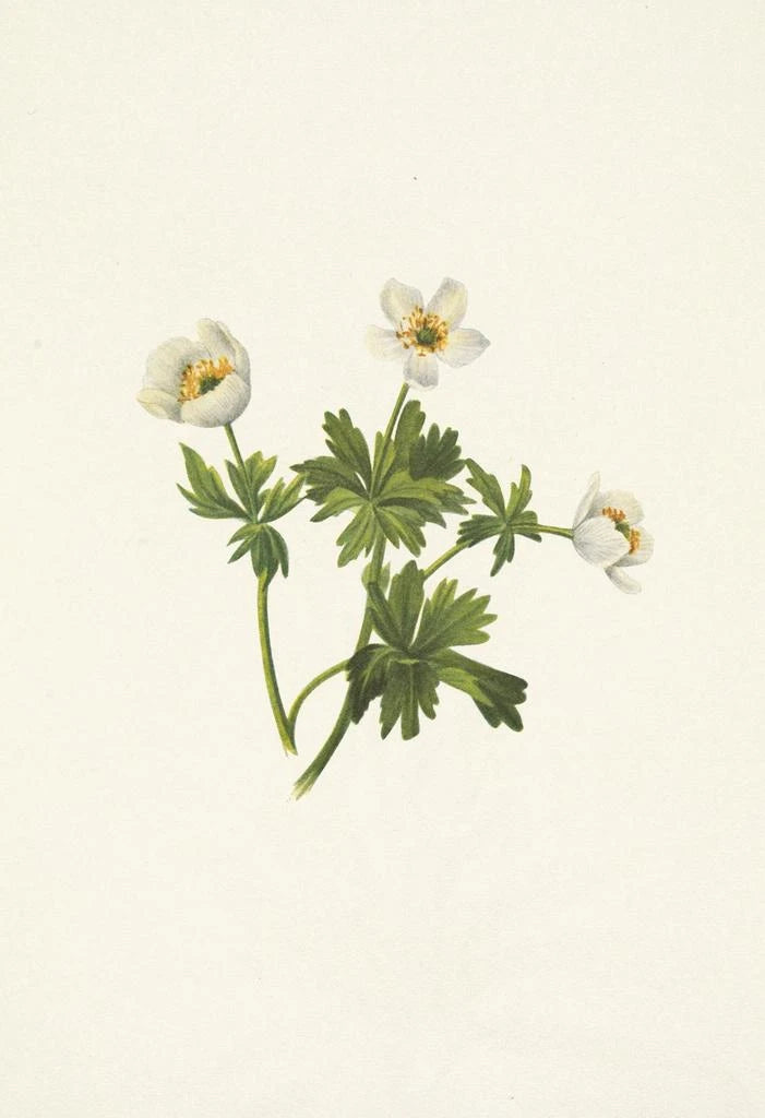 Den kunsttryk af den hvide Renoncule des Alpes, eller Trollius albiflorus, fremkalder renheden og roen i bjerglandskaberne. Med sine strålende hvide kronblade står denne blomst stolt og lyser op for de grønne alpine enge. Den akvarelteknik, der er brugt af Mary Vaux Walcott, giver en lethed til hele værket, mens de subtile nuancer af grønt og blåt i baggrunden skaber en beroligende atmosfære. Hvert detalje, fra nervetråde i bladene til fine skygger, vidner om en grundig observation af naturen og inviterer betragteren til at dykke ned i en verden af fred og ro.
