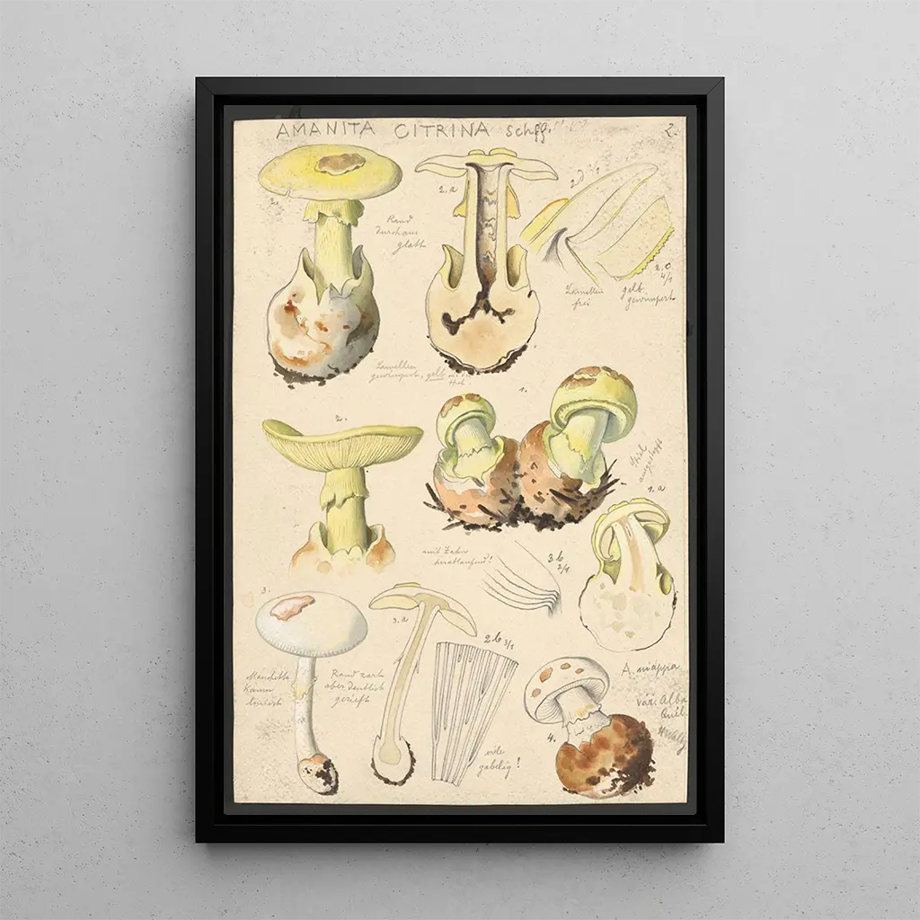 Kunsttrykket "Amanite citrine Schaeffer" af Hans Baldung er en fascinerende gengivelse af denne ikoniske svamp. Med sine strålende gule nuancer og detaljerede elementer fremkalder dette kunsttryk både skønheden og farerne, der er forbundet med naturen. Kompositionen, rig på teksturer, fanger øjet og inviterer til en udforskning af organiske former. Legene med lys og skygge skaber en næsten mystisk atmosfære, hvor hvert element synes at fortælle en historie. Dette kunsttryk, der befinder sig i skæringspunktet mellem kunst og botanik, tager os med ind i en verden, hvor naturen afslører sine mest intime hemmeligheder.