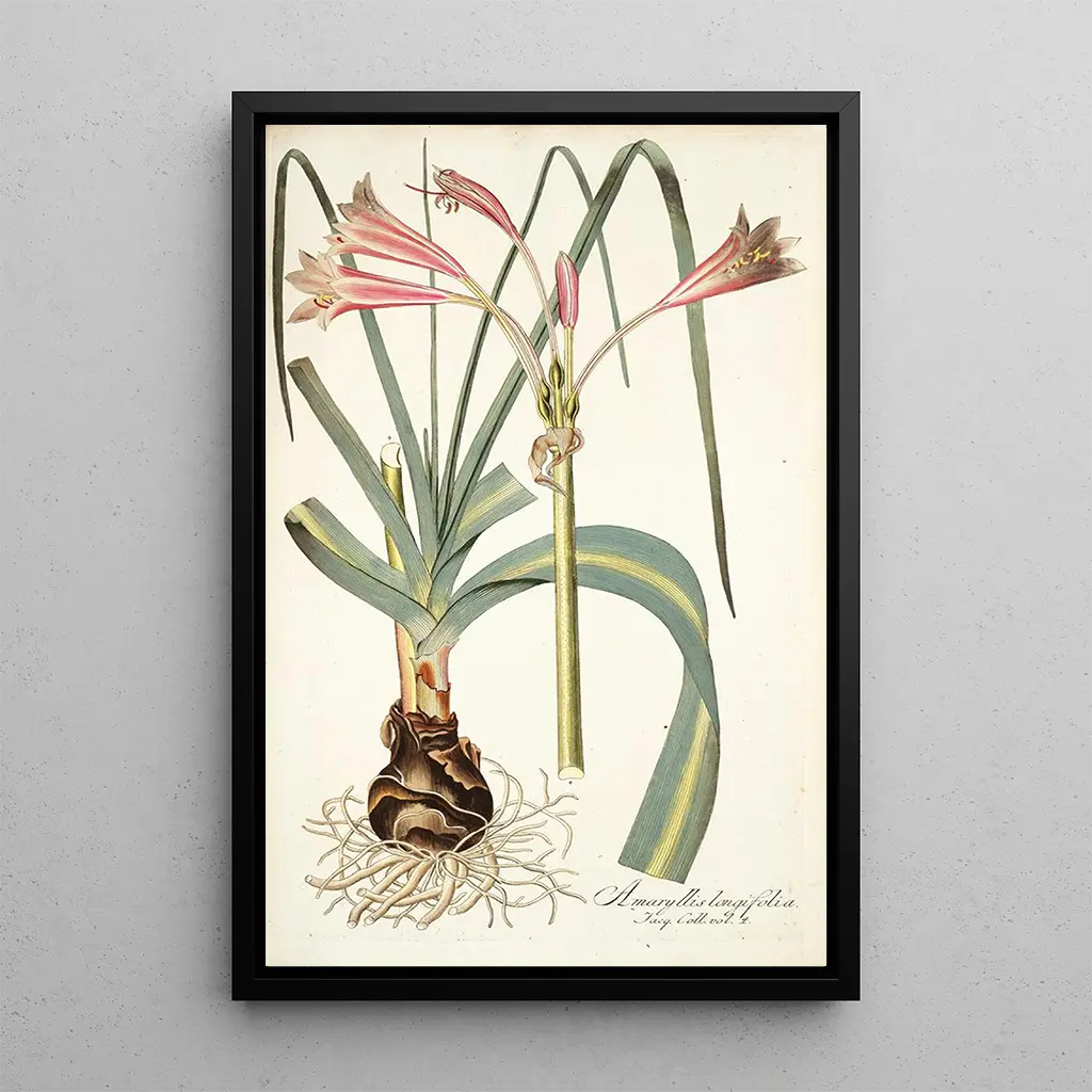 Amaryllis longifolia : en hyldest til blomsterens skønhed Nikolaus Joseph Freiherr von Jacquin's værk "Amaryllis longifolia" er en fascinerende repræsentation af denne ikoniske plante. Lærredet skiller sig ud med sine livlige farver og sin omhyggelige opmærksomhed på detaljer. Grønne og rosa nuancer blandes harmonisk, hvilket skaber en atmosfære, der er både livlig og beroligende. Kunstnerens teknik, der kombinerer botanisk præcision med kunstnerisk følsomhed, inviterer betragteren til at dykke ned i den delikate verden af flora. Hvert blomsterblad synes næsten håndgribeligt, og den overordnede komposition fremkalder en følelse af ro og fordybelse. Nikolaus Joseph Freiherr von Jacquin : en pioner inden for kunstnerisk botanik Nikolaus Joseph Freiherr von Jacquin, botaniker og kunstner fra det 18. århundrede, spillede en afgørende rolle i botanisk illustration. Hans værker, ofte skabt under hans rejser, vidner om hans dybe respekt for naturen og hans ønske om at dokumentere den med præcision. Påvirket af de videnskabelige opdagelser i sin tid, formåede Jacquin at forene videnskabelig stringens med æstetik, hvilket gjorde hans værker til referencer inden for botanisk illustration. Hans arbejde har ikke blot beriget viden om planter, men også markeret en æra, hvor kunst og videnskab gik hånd i hånd for at fejre verdens naturlige skønhed. En dekorativ tilføjelse med mange fordele Reproduktionen af "Amaryllis longifolia" er et ideelt dekorativt stykke til forskellige rum, uanset om det er i en stue, et kontor eller et soveværelse. Dens trykkvalitet og trofasthed over for de originale farver gør den til et attraktivt valg for dem, der ønsker at bringe et strejf af natur ind i deres hjem. Dette lærred, med sin raffinerede æstetik, tiltrækker opmærksomhed og skaber samtaler. Ved at integrere dette stykke i din indretning tilføjer du ikke blot et kunstværk, men også en genstand, der fremkalder naturens skønhed og ro, hvilket beriger dit daglige miljø.