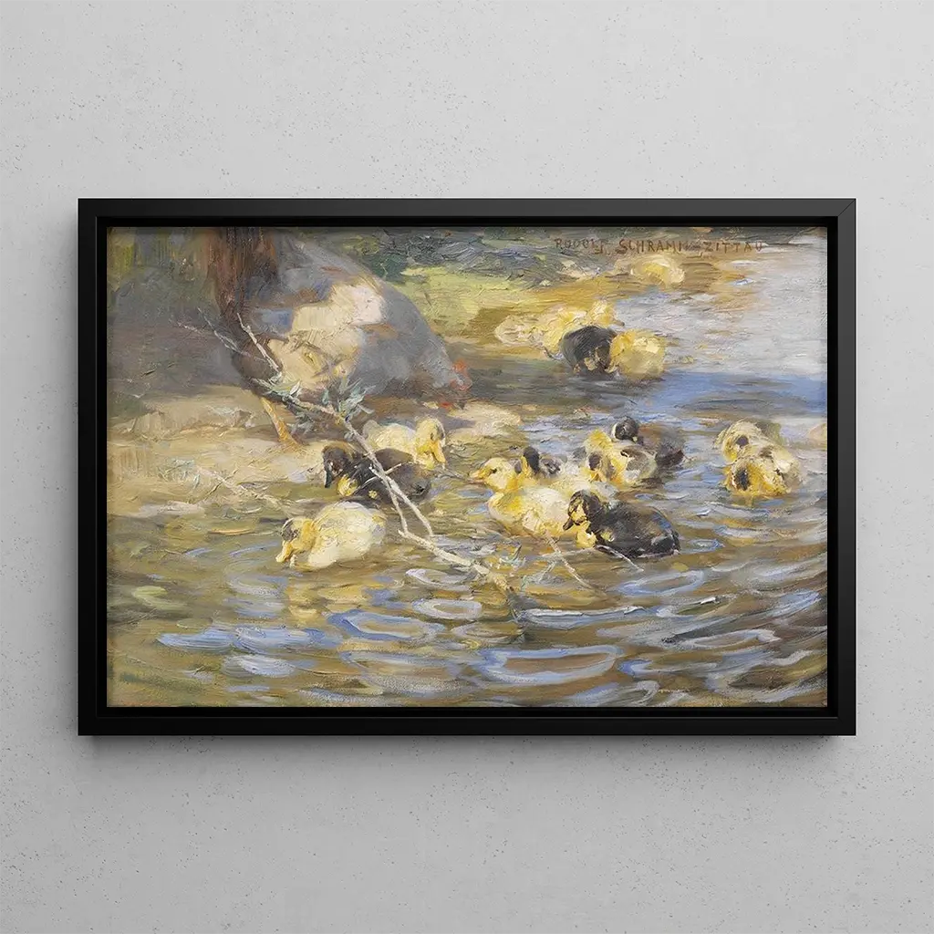 Kunsttryk Canards fordyber os i et levende maleri, hvor naturen blomstrer under Rudolf Schramm-Zittaus pensel. Anderne, afbildet i al deres pragt, bevæger sig i et fredeligt vandmiljø, omgivet af frodig vegetation. De livlige farver og de fine detaljer fanger essensen af dyrelivet, hvilket skaber en fredelig og glædesfyldt atmosfære. Hvert penselstrøg synes at tilføre disse fugle et nyt liv og inviterer betragteren til at værdsætte den enkle skønhed i naturen.