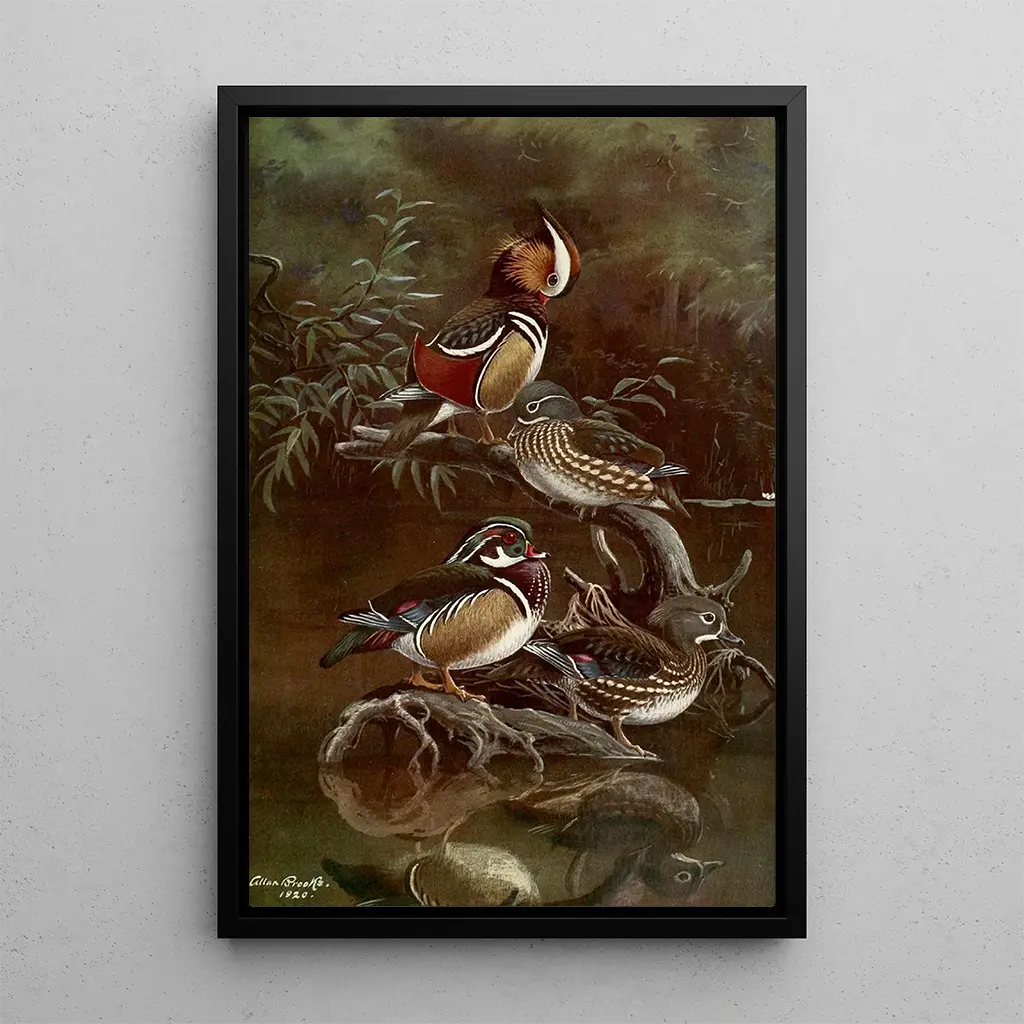 Kunsttrykket af kanard mandarin og kanard fra Caroline fører os ind i et maleri, hvor ynde og farve væves sammen. Allan Brooks, med sit skarpe øje for detaljer, fremhæver disse vadefugles pragt, deres skinnende fjerdragt, der lyser scenen op. Den dynamiske komposition, hvor ænderne synes at bevæge sig let, skaber en levende og glædelig atmosfære. Refleksionerne i vandet og lysets leg tilføjer en poetisk dimension til dette værk, der inviterer betragteren til at værdsætte naturens skønhed gennem kunstens prisme.