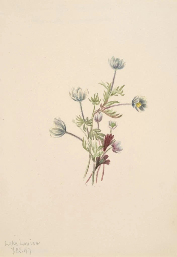 L'anemone drummondii, fanget af Mary Vaux Walcott, fremkalder en flygtig og skrøbelig skønhed. Dette værk, skabt med omhu og opmærksomhed på detaljer, illustrerer de delikate kronblade af blomsten, hvis nuancer af hvid og violet smelter harmonisk sammen. Den akvarelteknik, kunstneren anvender, giver kompositionen en lethed, næsten svævende, der inviterer til en rolig refleksion. Atmosfæren, der udspringer af dette maleri, er præget af blidhed og fred, og transporterer betragteren til en hemmelig have, hvor naturen blomstrer.