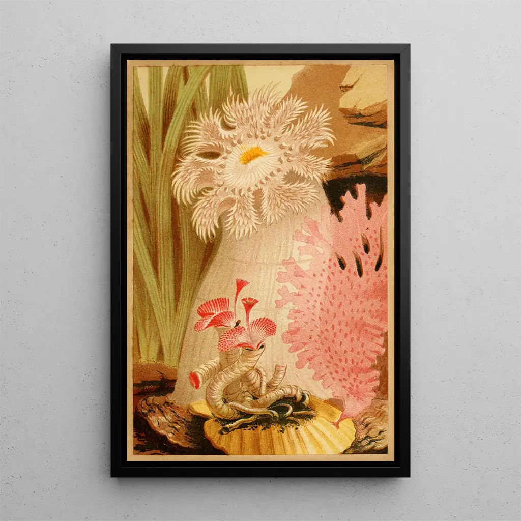 L'Anémone plumeuse er et kunsttryk, der fremkalder lethed og ynde hos havets væsner. Gennem dette kunsttryk blander de pastelnuancer og delikate former sig for at skabe et levende, næsten dansende maleri. Philip Henry Gosse, med sin beherskelse af nuancer og teksturer, formår at fange essensen af denne anemone og hylde dens flygtige skønhed. Atmosfæren, der udspringer af dette kunstværk, inviterer til drømmende refleksion og transporterer betragteren til en undervandsverden, hvor hver detalje betyder noget.