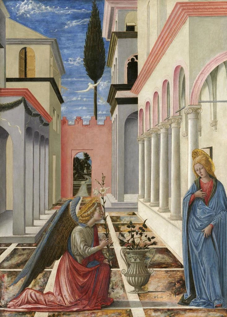 L'Annonciation, et ikonisk kunstværk af Fra Carnevale, fanger det hellige øjeblik, hvor ærkeenglen Gabriel annoncerer for Jomfru Maria, at hun vil blive gravid med Guds Søn. Kompositionen er præget af en delikat harmoni, hvor pastelfarver blander sig med guldnuancer, hvilket skaber en atmosfære, der både er rolig og mystisk. Teknikken med tempera på træ tillader en bemærkelsesværdig detaljering, fra klædernes folder til ansigtets udtryk. Hvert element i dette lærred synes at vibrere af en håndgribelig spiritualitet, der inviterer betragteren til at reflektere over dette afgørende øjeblik i den kristne historie.