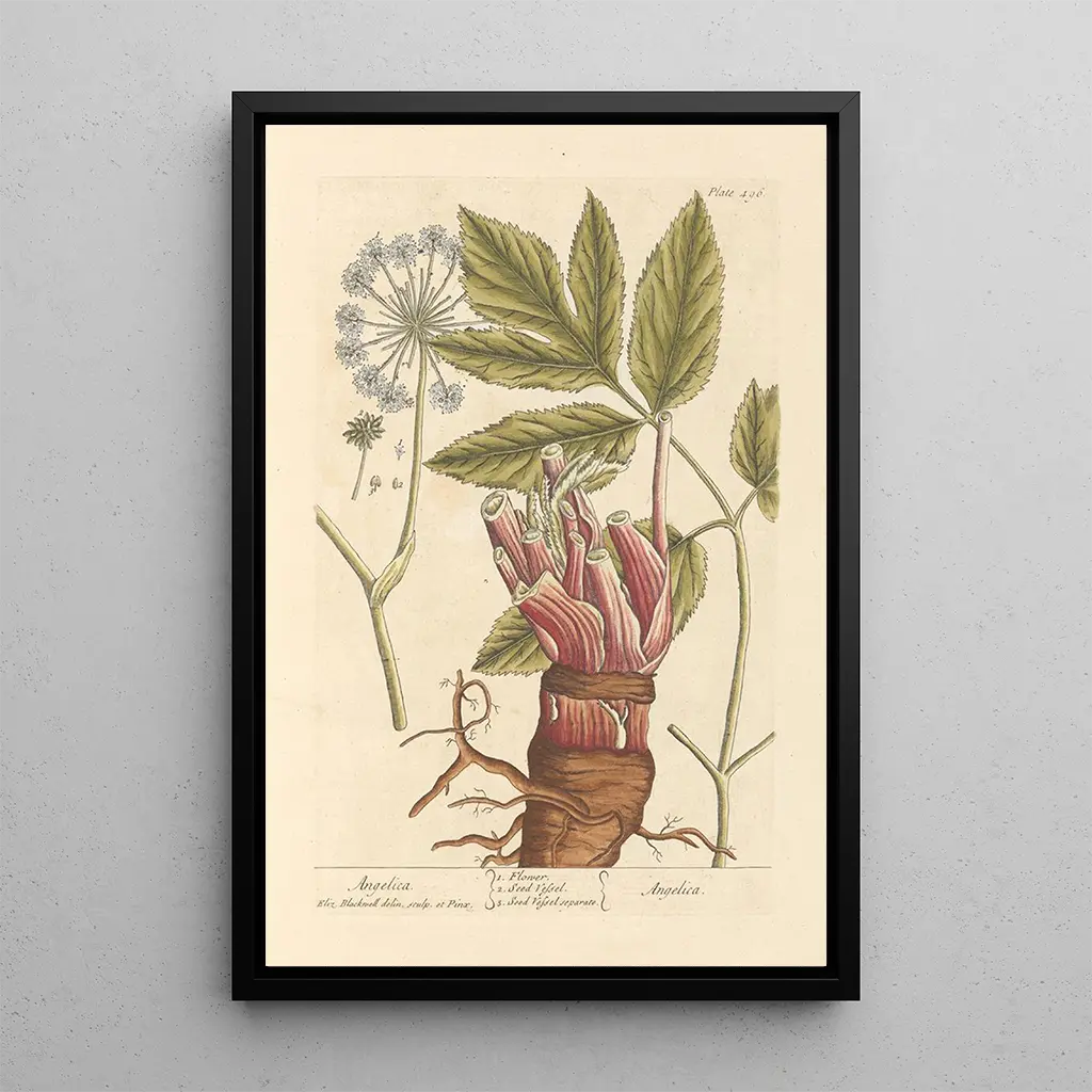 L’œuvre Angélique af Elizabeth Blackwell er en fascinerende fremstilling af denne plante, fanget med bemærkelsesværdig botanisk præcision. De bløde og naturlige farver, der spænder fra sart grøn til strålende hvid, fremkalder en fredelig og rolig atmosfære. Akvarelteknikken, kombineret med en fin og delikat streg, fremhæver detaljerne i blade og blomster. Hvert element synes at få liv, hvilket inviterer betragteren til at dykke ned i en blomsterverden præget af blidhed og lethed. Dette kunsttryk af Angélique er meget mere end blot et maleri; det er en fejring af naturens skønhed.