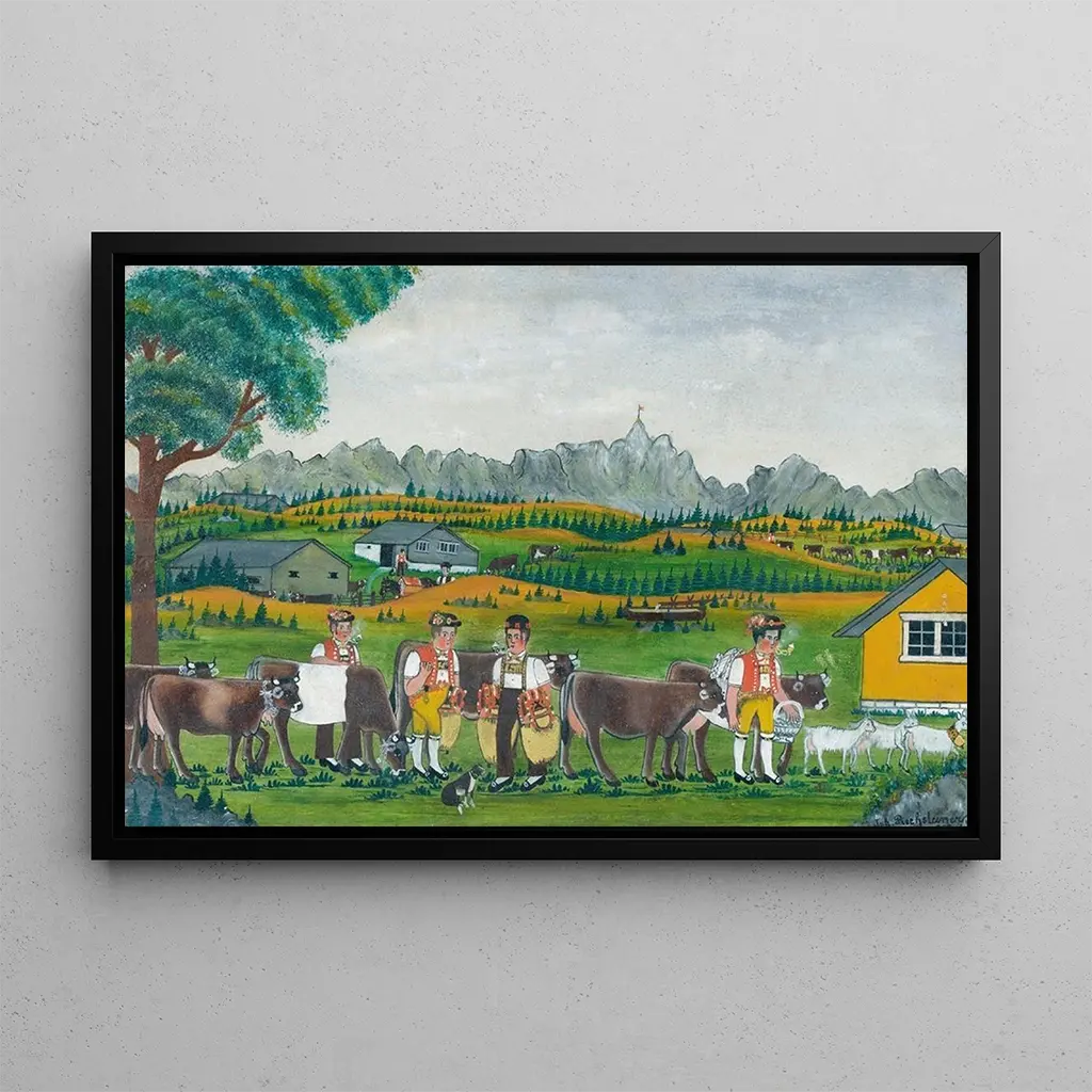 Arrivée à l'alpage : en hyldest til de alpine natur "Arrivée à l'alpage", værk af Johannes Rechsteiner, fremhæver den majestætiske skønhed i de alpine landskaber. Dette kunsttryk indfanger et øjeblik af ro, hvor personerne, omgivet af imponerende bjerge, synes i harmoni med naturen. De bløde nuancer af grøn og blå, kombineret med strejf af gyldent lys, skaber en fredelig og kontemplativ atmosfære. Rechsteiners teknik, præget af en omhyggelig opmærksomhed på detaljer, gør det muligt at mærke den alpine lufts friskhed og det fredelige miljø, hvilket inviterer betragteren til at drømme sig væk til dette idylliske landskab. Johannes Rechsteiner : en maler af schweiziske landskaber Johannes Rechsteiner, schweizisk kunstner fra det 19. århundrede, er kendt for sine alpine landskaber, der afspejler hans kærlighed til naturen. Påvirket af romantikken, formåede han at fange de schweiziske bjergenes majestæt med en unik følsomhed. Hans karriere, selvom den er mindre kendt end nogle af hans samtidiges, var præget af et ønske om at repræsentere den naturlige skønhed i sit land. Rechsteiner har bidraget til fremkomsten af en national identitet gennem kunst, hvor de schweiziske landskaber fremhæves som symboler på stolthed og æstetik. En dekorativ erhvervelse med mange fordele Kunsttrykket af "Arrivée à l'alpage" er et perfekt dekorativt valg for dem, der ønsker at tilføre et strejf af natur til deres hjem. Uanset om det er i en stue, et kontor eller et soveværelse, tilbyder dette lærred en enestående trykkvalitet og en trofast gengivelse af det originale værk, hvilket vil tiltale alle kunstelskere. Dets æstetiske appel, kombineret med den ro, det udstråler, forvandler ethvert rum til et fredeligt tilflugtssted. Ved at integrere dette værk i din indretning inviterer du schweiziske alper ind i dit hjem og skaber en beroligende og inspirerende atmosfære.