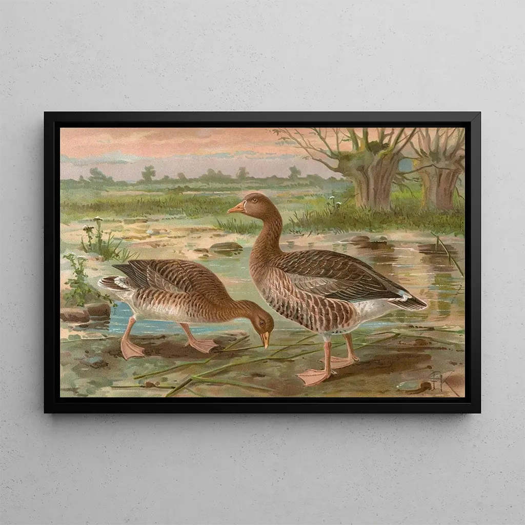 Kunsttrykket Anser anser af Johann Friedrich Naumann indfanger den majestætiske skønhed af grågåsen i dens naturlige habitat. Med delikate farver og omhyggelige detaljer fremkalder dette værk en fredelig og eftertænksom atmosfære. Nuancerne af brunt og gråt blander sig harmonisk, mens den slørede baggrund fremhæver hovedmotivet. Akvarelteknikken, anvendt med finesse, giver letheden af fjerene og bevægelsens flydende karakter. Denne livlige gengivelse inviterer betragteren til at dykke ned i en verden, hvor naturen regerer som mester.