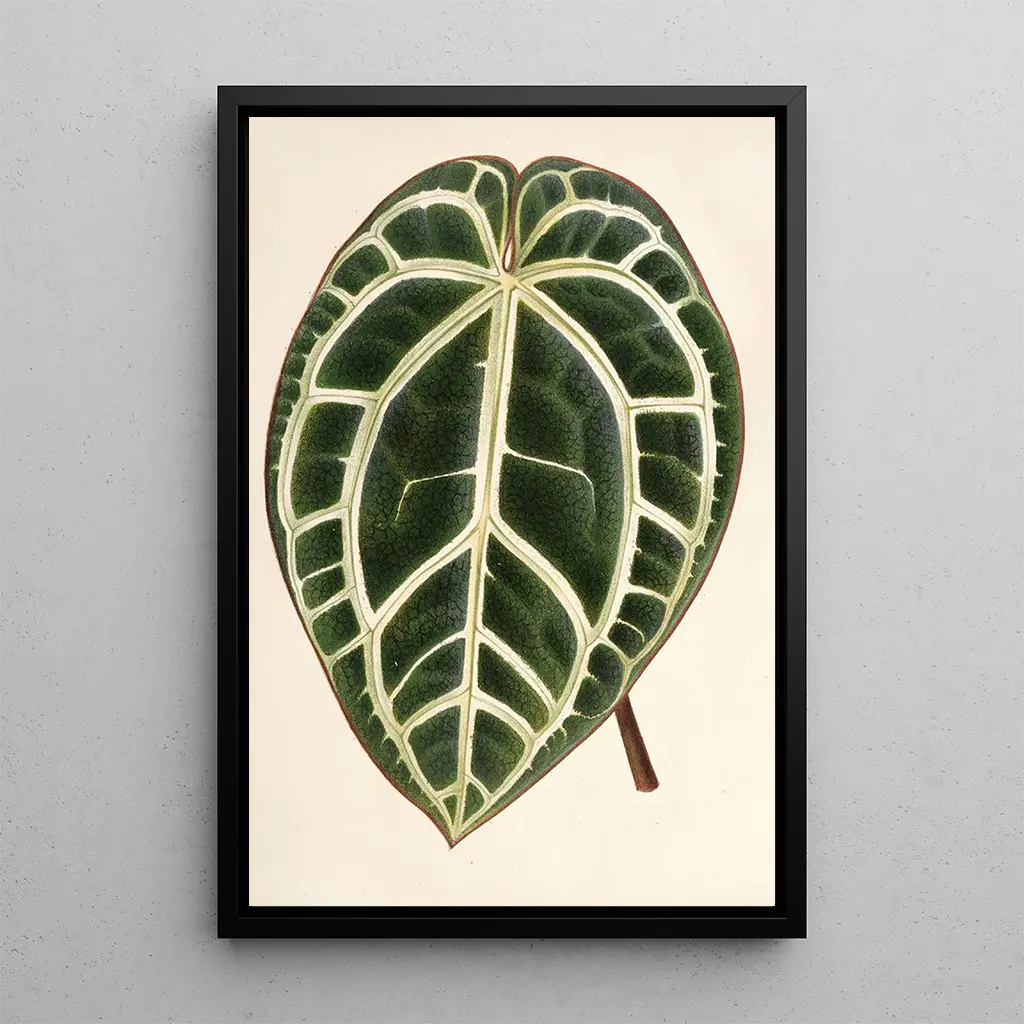 L'Anthurium crystallinum, med sine store hjerteformede blade, fremkalder en delikat dans mellem lys og skygge. De hvide årer, der løber gennem bladets overflade, skaber en slående kontrast til den dybe grønne, hvilket giver en atmosfære, der både er beroligende og dynamisk. Denne tropiske plante, ofte dyrket for sin dekorative skønhed, tiltrækker opmærksomhed med sin naturlige elegance. Den fløjlsagtige tekstur af bladene tilføjer en taktil dimension, hvilket gør reproduktionen af dette levende maleri særligt fængslende. Hvert detalje, fra farvetoner til organiske former, inviterer til en langvarig eftertanke, som om naturen selv afslører sin pragt.