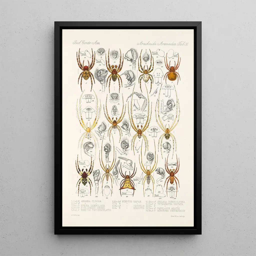 "{{Arachnida Araneidea Pl 36}}" af Frederick DuCane Godman er et kunsttryk, der fanger essensen af edderkopper i deres naturlige habitat. Med en palette af livlige farver og en omhyggelig opmærksomhed på detaljer, synes hver edderkop at komme til live på nettet. Den anvendte teknik, der kombinerer akvarel og tegning, skaber en atmosfære, der er både realistisk og poetisk. De yndefulde former af edderkopper, fremhævet af subtile skygger, inviterer til en visuel udforskning, der afslører den skjulte skønhed i disse ofte misforståede væsener.
