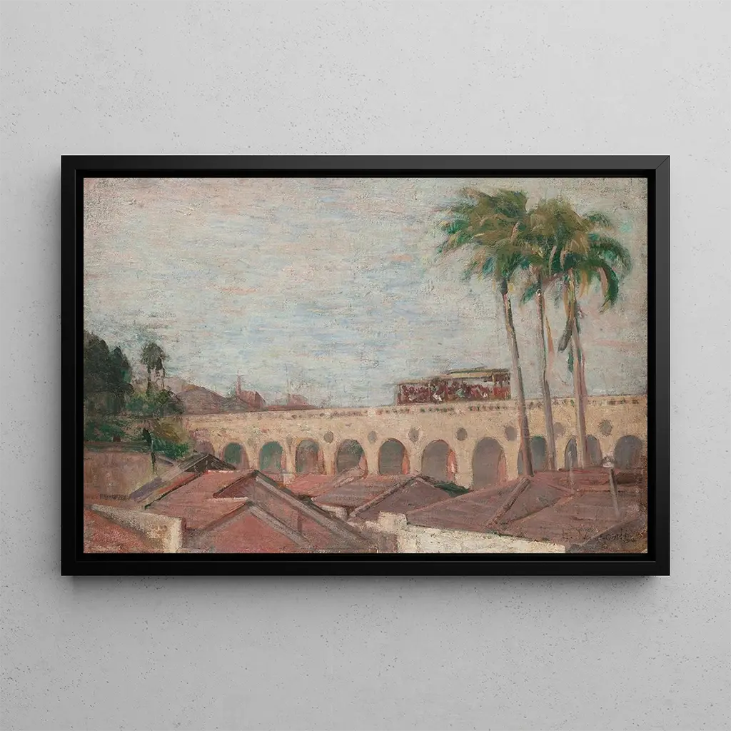 Kunsttrykket Arcos da Lapa af Eliseu Visconti fremkalder et øjebliks suspension i tiden, hvor den majestætiske arkitektur smelter sammen med Rio de Janeiros pulserende liv. De imponerende buer, badet i varme og lyse nuancer, synes at invitere betragteren til at dykke ned i byens livlige stemning. Kunstnerens teknik, der kombinerer akvarel og olie, skaber en atmosfære, der er både blid og dynamisk, og fanger essensen af dette ikoniske monument. De omhyggelige detaljer i de omkringliggende bygninger og forbipasserende tilføjer en narrativ dimension, hvilket gør dette lærred levende og engagerende.