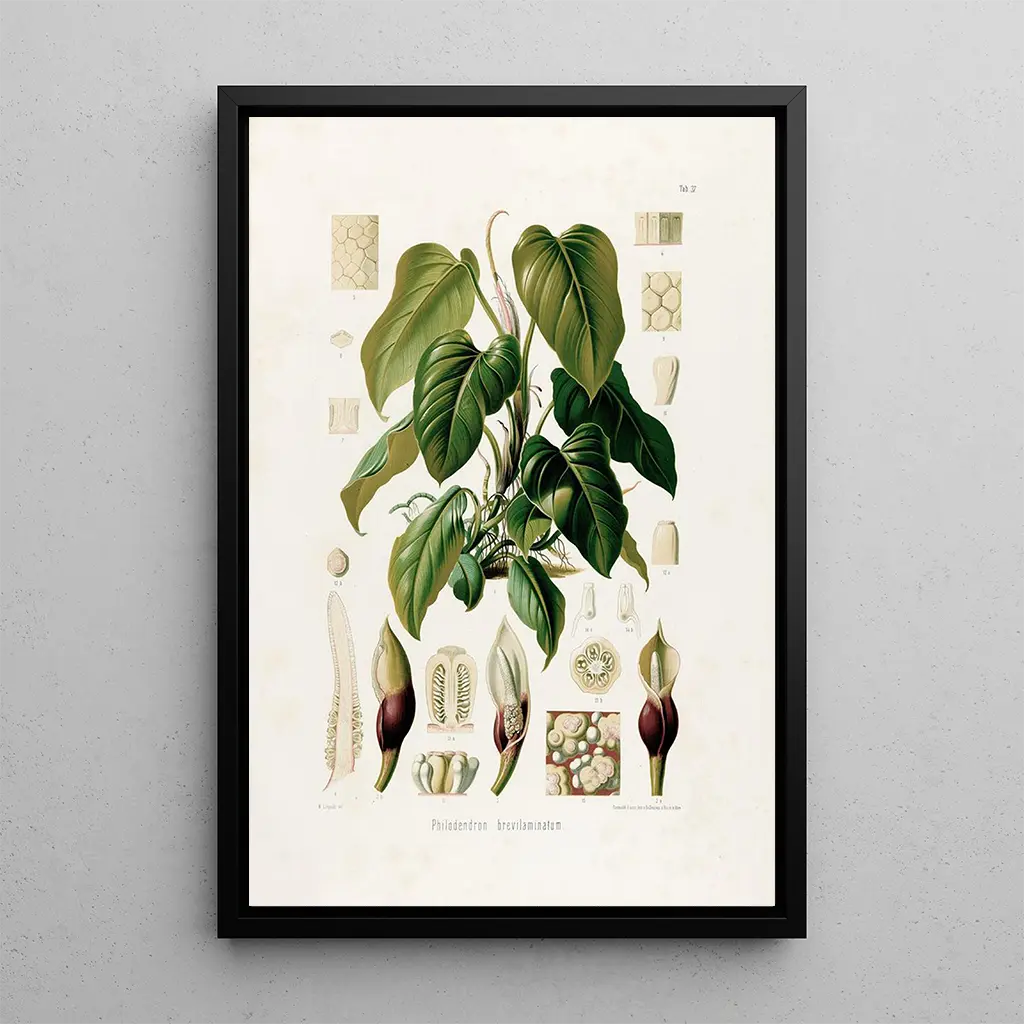 Kunsttrykket Aroideae Maximilianae Pl37 er et værk, der fremhæver den fascinerende mangfoldighed af aroides. Med sine delikate nuancer af grøn og sine rige teksturer inviterer dette lærred til en visuel udforskning af organiske former. Den graveringsteknik, Heinrich Wilhelm Schott anvendte, gør det muligt at gengive hver detalje med bemærkelsesværdig præcision, hvilket skaber en atmosfære, der er både rolig og livlig. Værket synes at fange et suspendet øjeblik i tiden, hvor naturens skønhed udtrykkes i al sin pragt.