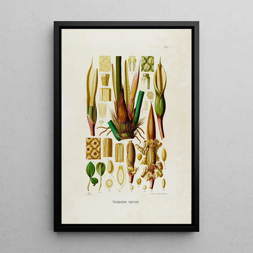 Kunsttrykket Aroideae Maximilianae Pl42 udmærker sig ved sin delikate sammensætning og sine livlige nuancer. Hvert blad, omhyggeligt detaljeret, synes at danse under lyset og afslører rige teksturer og organiske former. Akvarelteknikken, anvendt af Schott, giver dette værk en næsten æterisk atmosfære, der inviterer betragteren til at dykke ned i det fascinerende univers af tropiske planter. Farverne, fra dyb grøn til strålende gul, fremkalder frodigheden i de fugtige skove og skaber et levende maleri, der fejrer naturens skønhed.