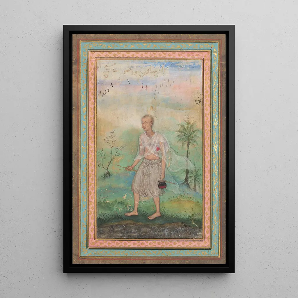 I dette fængslende værk står den jaïnske ascet majestætisk langs en bred, indhyllet i en atmosfære af ro og meditation. De jordfarvede nuancer, blandet med strejf af blå og grøn, fremkalder den omkringliggende natur, mens kunstnerens delikate teknik understreger dybden af menneskelige følelser. Kompositionen, centreret omkring ascetens figur, inviterer betragteren til en introspektiv refleksion, en søgen efter indre fred. Hvert detalje, fra hans klædedragt til hans ansigtsudtryk, vidner om en kunstnerisk mestring, der transcenderer det simple visuelle for at røre sjælen.