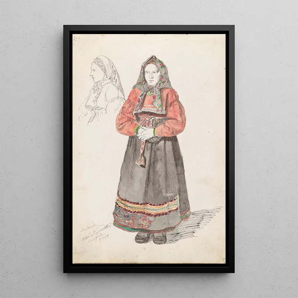 "Aslaug Bjørnsdatter Moseb Sauland" er et kunsttryk af Adolph Tidemand, der fejrer skønheden i de norske traditioner gennem portrættet af en kvinde med et beslutsomt blik. Kompositionen fremhæver detaljerede elementer, såsom broderierne på hendes kjole og de typiske accessories fra hendes tid, hvilket skaber en autentisk og varm atmosfære. De livlige farver og de delikate nuancer i lærredet fremkalder den rige kultur i Skandinavien, mens Tidemand's teknik, der kombinerer realisme og romantik, giver liv til denne ikoniske figur. Dette kunsttryk inviterer til refleksion over identitet og kvinders rolle i det norske samfund i det XIX. århundrede.
