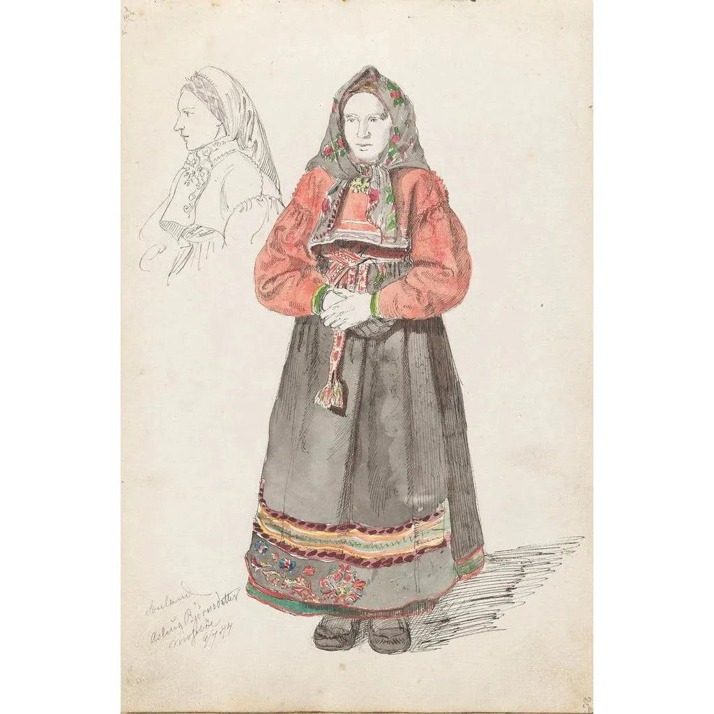 Adolph Tidemand, født i 1814, er anerkendt som en af de førende kunstnere inden for den romantiske bevægelse i Norge. Hans karriere var præget af et ønske om at skildre landlivet og de folkelige traditioner, ofte inspireret af hans rejser gennem landet. Tidemand studerede i København, hvor han blev påvirket af de store mestre inden for realisme. Hans værker, såsom "Aslaug Bjørnsdatter Moseb Sauland", afspejler en dyb beundring for naturen og de norske skikke, samtidig med at de fremhæver værdigheden af de personer, han portrætterer. Dette kunsttryk er en del af en serie værker, der hylder den kulturelle arv i hans hjemland.