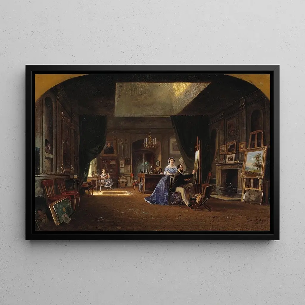 Kunstværket "L'atelier de Karl XV" af Pierre Tetar van Elven tager os med ind i den fascinerende verden af den svenske kongerige i det 19. århundrede. Kompositionen, rig på detaljer, afslører et skabermiljø, hvor det naturlige lys belyser ansigterne på personerne og skaber en varm og indbydende atmosfære. Farverne, bløde og harmoniske, fremkalder roen i et øjeblik delt mellem kunstneren og hans model. Olie-maleri teknikken, mestret af van Elven, gør det muligt at fange teksturerne af tøjet og objekterne i atelieret, hvilket gør hele værket levende og tilgængeligt.