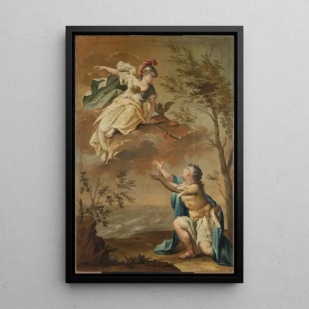 "Athéna og Ulysses" af Rienk Keyert er et kunsttryk, der fordyber seeren i den rige verden af græsk mytologi. Den dynamiske komposition viser gudinden Athéna, beskytter af helte, i interaktion med Ulysses, berømt for sin intelligens og list. De levende farver og slående kontraster skaber en pulserende atmosfære, mens Keyerts teknik, der kombinerer realisme og stiliserede elementer, giver liv til dette ikoniske møde. Lærredet inviterer til refleksion over mod og visdom, universelle temaer, der genlyder gennem tiderne.
