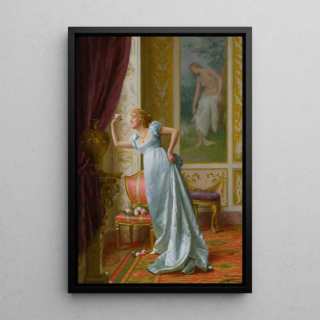 Kunsttrykket "L'Attraction" af Vittorio Reggianini tager os med på en rejse i et raffineret univers, hvor skønhed og ynde flettes sammen. Dette maleri, rigt på detaljer, skildrer en intim scene, hvor en kvinde, klædt i en overdådig kjole, tiltrækker opmærksomhed med sin uimodståelige charme. De varme farver og de delikate nuancer skaber en atmosfære, der er både romantisk og nostalgisk. Reggianini anvender en oljemaleri-teknik, der fremhæver teksturerne i stoffet og lysstyrken i ansigterne, hvilket gør hvert element levende. Dette maleri er en ægte invitation til fordybelse, hvor hvert blik afslører en ny facet af elegance.