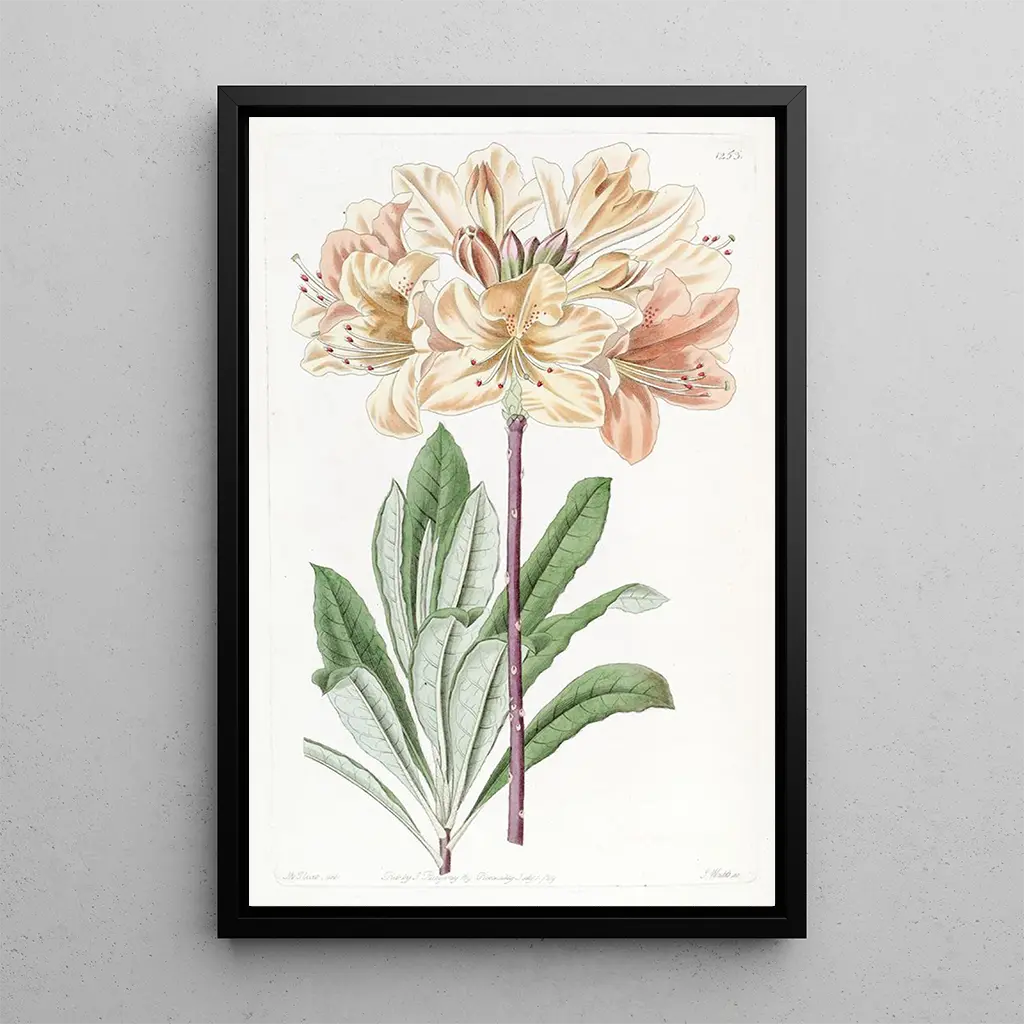 L’Azalée gul fra Kina, ettersyn af Sydenham Edwards, fremkalder den flygtige skønhed af en blomstrende forårssæson. Dette kunsttryk fremhæver livlige nuancer af gult og grønt, hvilket skaber en lys og glædesfyldt atmosfære. Akvarelteknikken, med sine delikate nuancer og subtile overgange, fanger lethed i blomsterbladene, næsten svævende i luften. Hvert minut detalje er omhyggeligt gengivet, fra bladnerver til skygger, hvilket inviterer til fordybelse i naturen.
