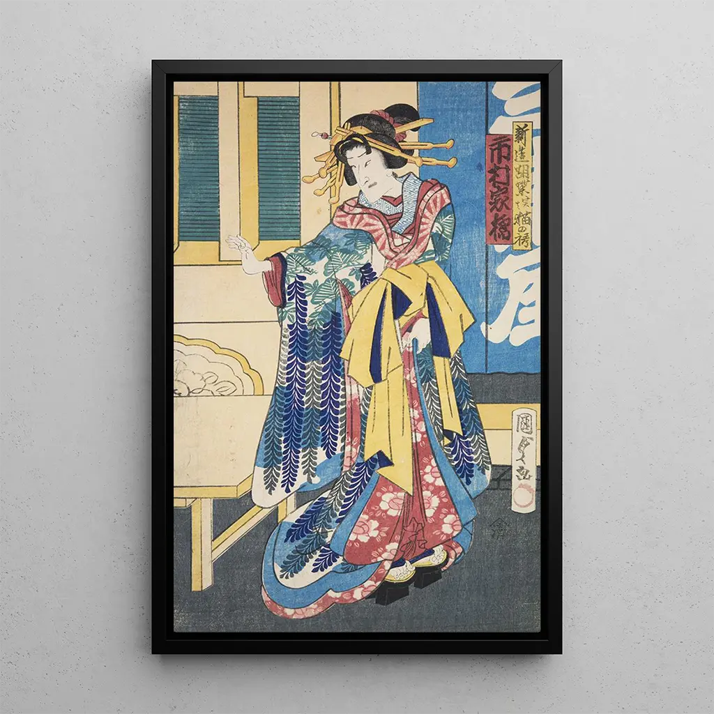 Kunsttrykket Azuma nishikie Pl76 fanger en delikat scene, hvor naturen og menneskeheden mødes i en perfekt harmoni. Pastelfarver og raffinerede mønstre fremkalder den flygtige skønhed af årstiderne, typisk for den japanske æstetik. Hvert detalje, fra blomster til figurer, er gengivet med omhu takket være træsnit-teknikken. Dette værk inviterer til en blid og drømmende refleksion, der transporterer betragteren til en verden, hvor tiden synes at stå stille. Den afbalancerede komposition og de subtile nuancer skaber en rolig og poetisk atmosfære.