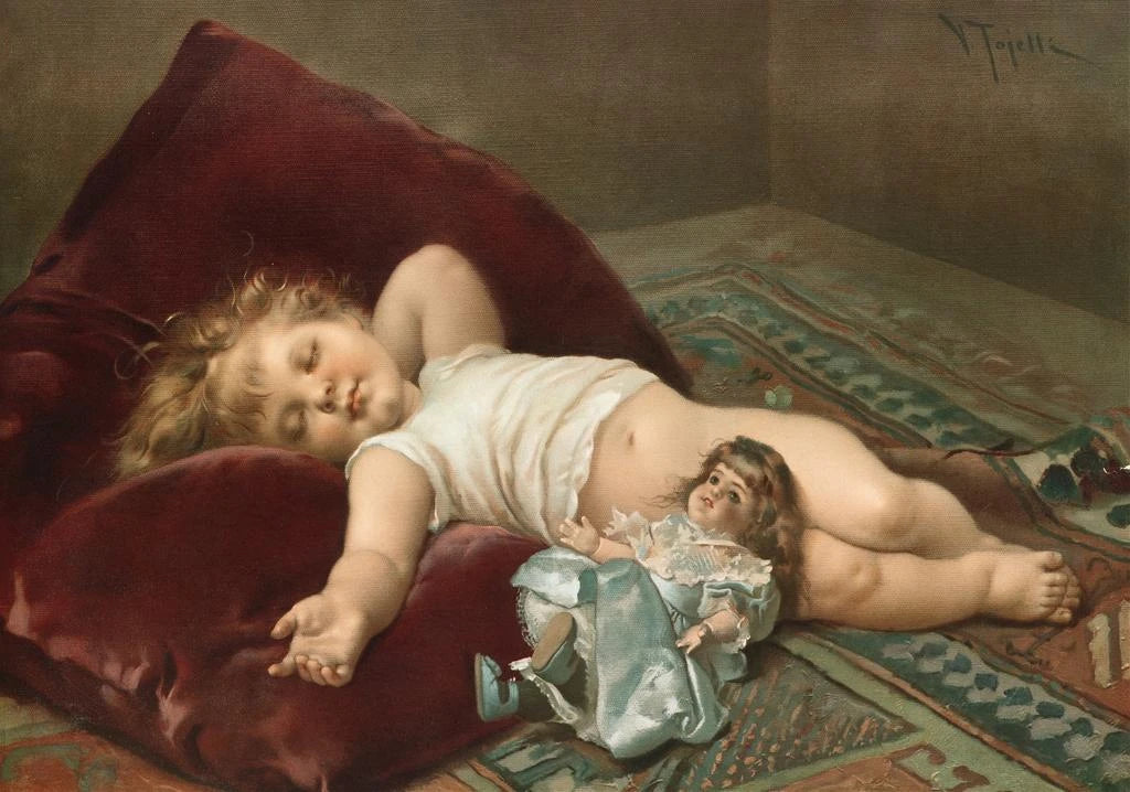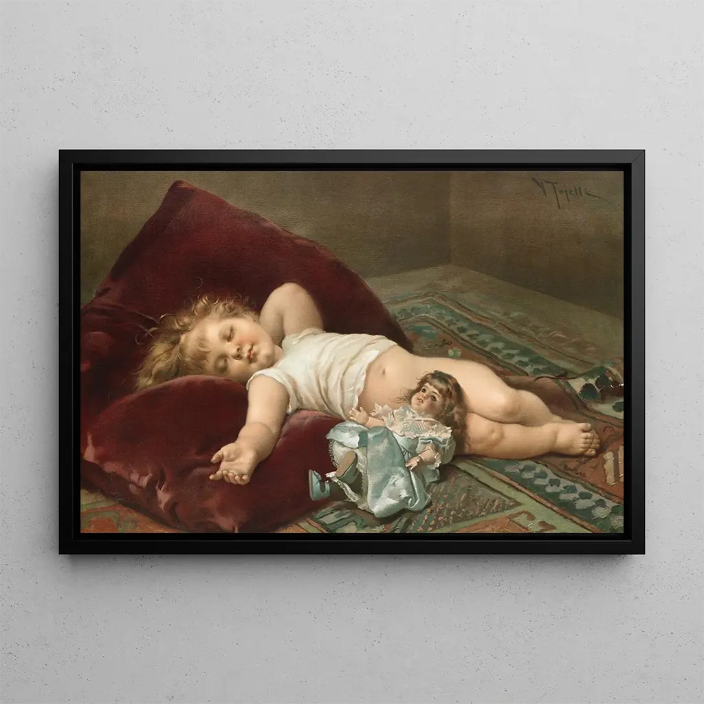 Virgilio Tojetti, italiensk maler fra det XIX. århundrede, er kendt for sine genre- og portrætmalerier fyldt med realisme. Påvirket af romantikken, formåede han at fange intime og rørende øjeblikke fra dagligdagen. Tojetti har ofte skildret børn, hvilket fremhæver deres uskyld og naturlige skønhed. Hans karriere, selvom den er mindre kendt end nogle samtidiges, har sat et varigt præg i kunstverdenen. "Bébé endormi" er et perfekt eksempel på hans talent, der illustrerer hans evne til at fange flygtige øjeblikke med stor følelsesmæssig dybde.