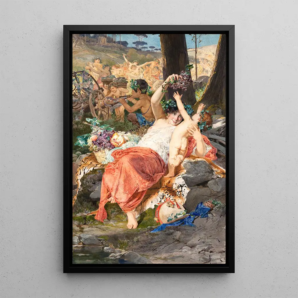 I dette livlige værk tager Julius Kronberg os med til hjertet af en scene fyldt med sensualitet og bevægelse. Bacchante, en mytologisk figur, er afbildet i en vild dans, omgivet af frodige blade og strålende frugter. De varme farver og lyslege understreger energien i kompositionen, mens kunstnerens teknik, der blander realisme og symbolske elementer, skaber en fortryllende atmosfære. Hvert detalje, fra de flydende klæder til de glade udtryk, inviterer til en dyb refleksion over skønheden i livet og naturen.