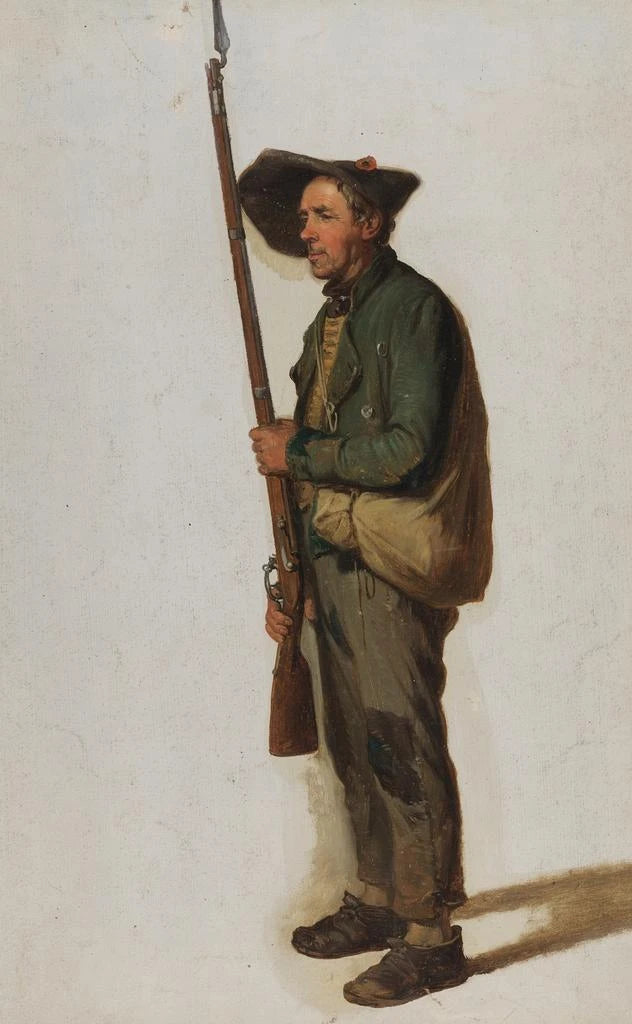 Johann Baptist Kirner, aktiv i det 19. århundrede, er kendt for sine skildringer af dagliglivet og militære scener. Påvirket af romantikken søger han at fange essensen af de personer, han maler, uanset om de er bønder eller soldater. Hans interesse for almindelige menneskers liv og historiske begivenheder gør det muligt for ham at skabe værker, der resonnerer med publikum. "Ordonnance badoise med et gevær" indgår i denne tradition, og illustrerer ikke kun soldatens rolle i samfundet, men også vigtigheden af kollektiv hukommelse og regional identitet.